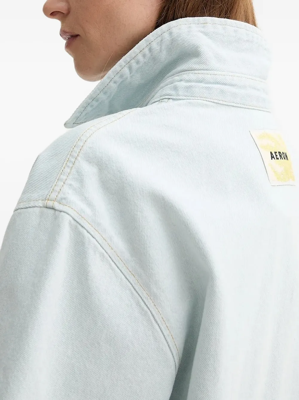 Светло-голубые короткие рукава, застежка на пуговицы, нагрудный карман, контрастная строчка.