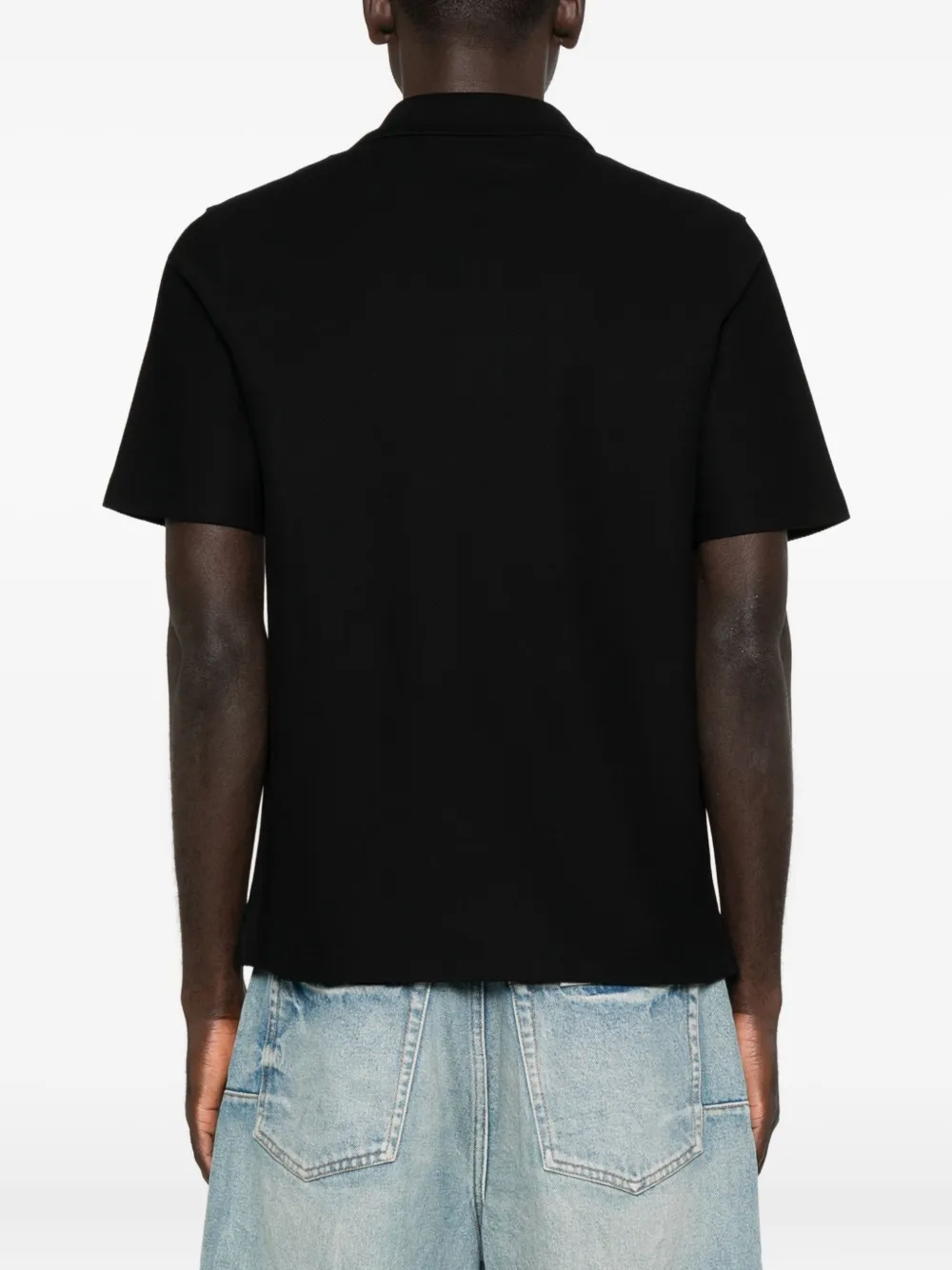 Черная хлопковая застежка на три пуговицы, короткие рукава, вышитый логотип, ребристый воротник.