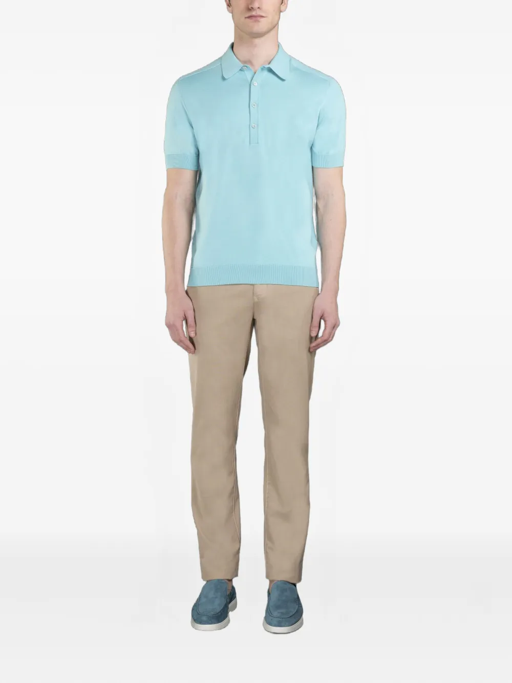 Светло-голубой короткий рукав, воротник-поло, застежка на пуговицы, трикотаж