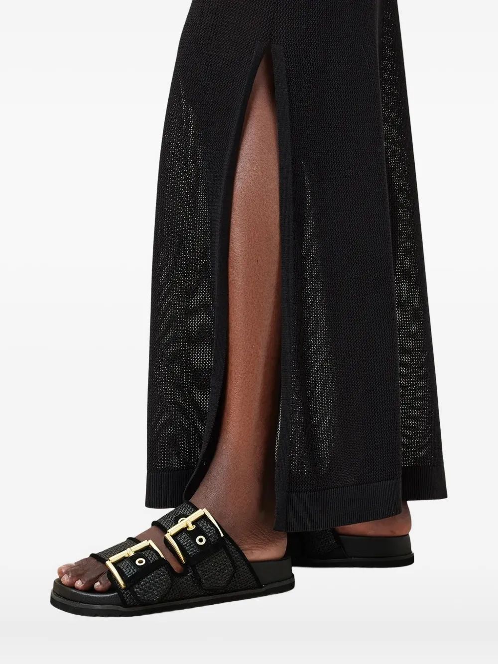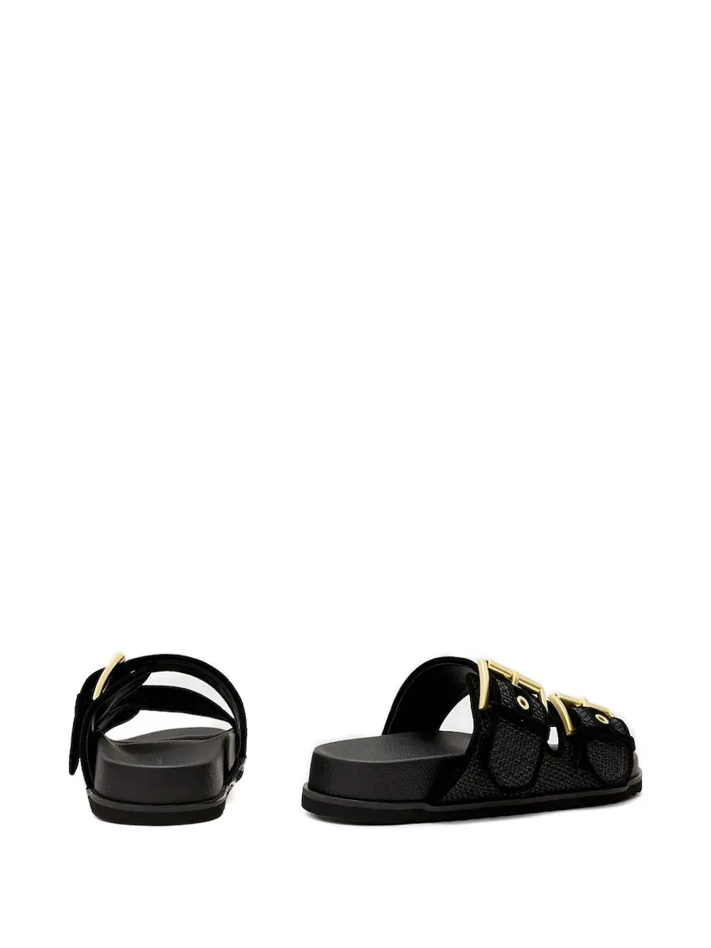 Черная застежка на двойную пряжку, золотистые пряжки, плоская подошва, открытый носок.