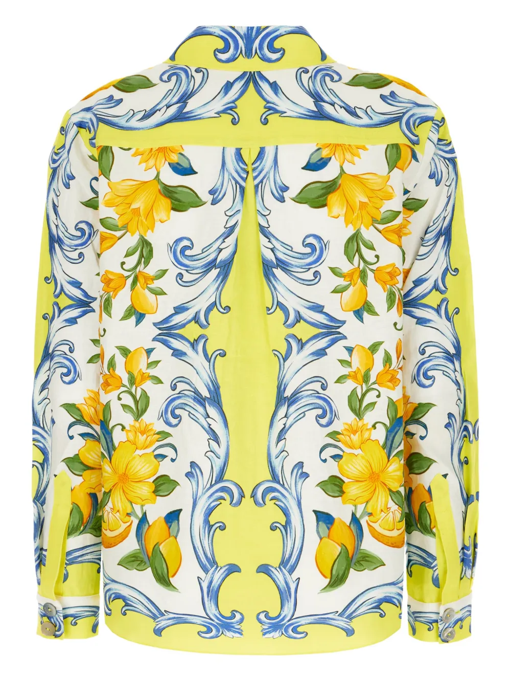 Желтая льняная ткань с лимонно-цветочным принтом, длинными рукавами, застежкой на пуговицы, классическим воротником.