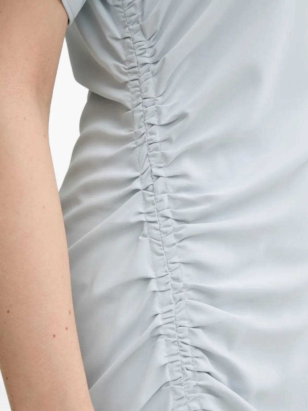 Светло-голубой, с короткими рукавами, круглым вырезом и разрезами по бокам.