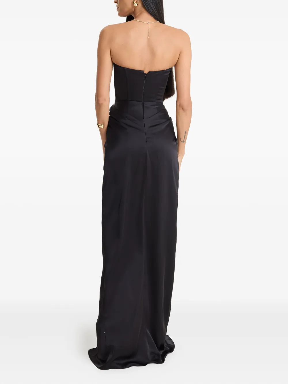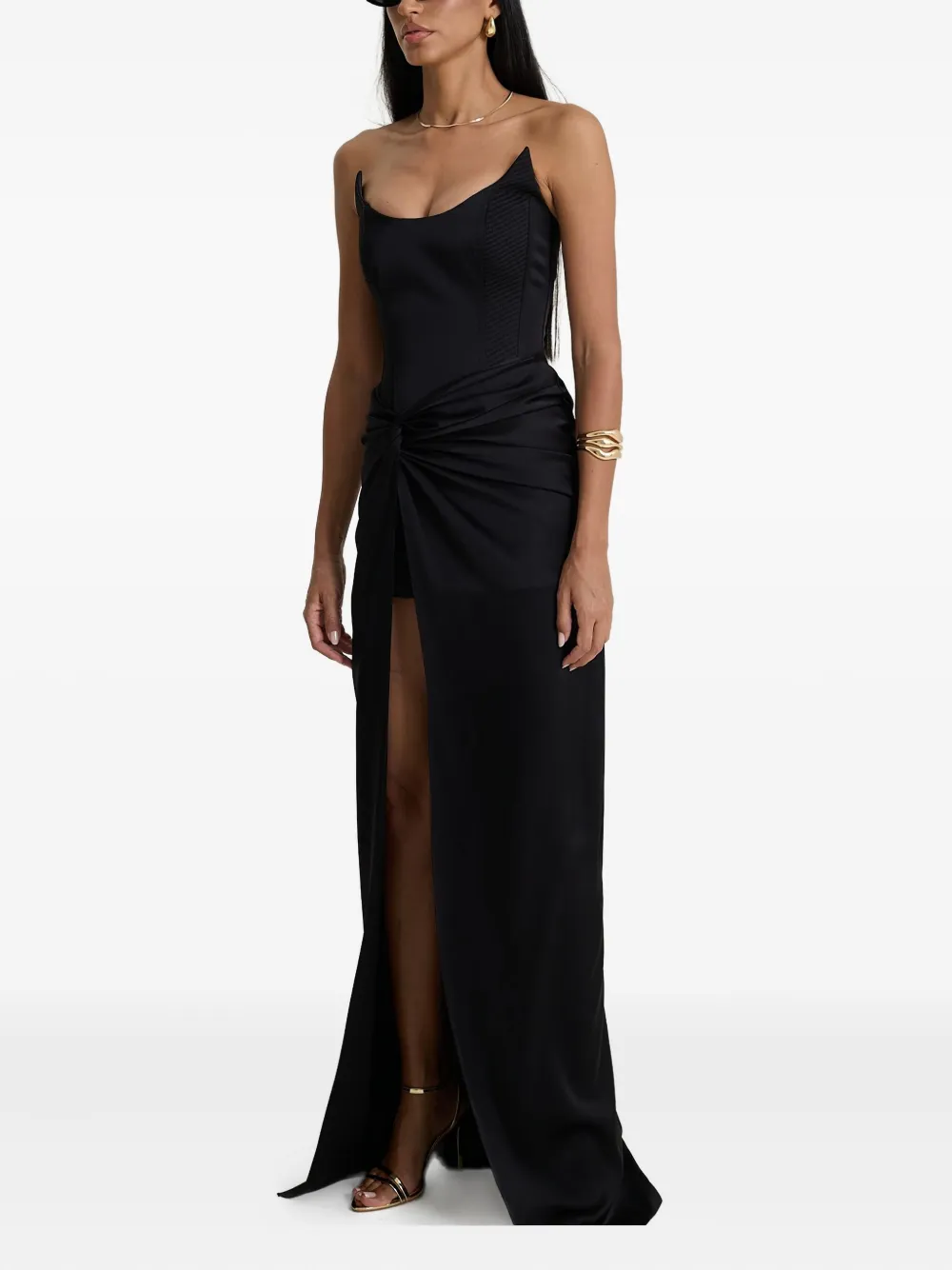 Черный корсет без бретелек с перекрученными деталями, разрез спереди, длина макси