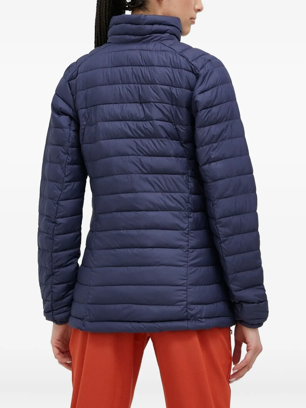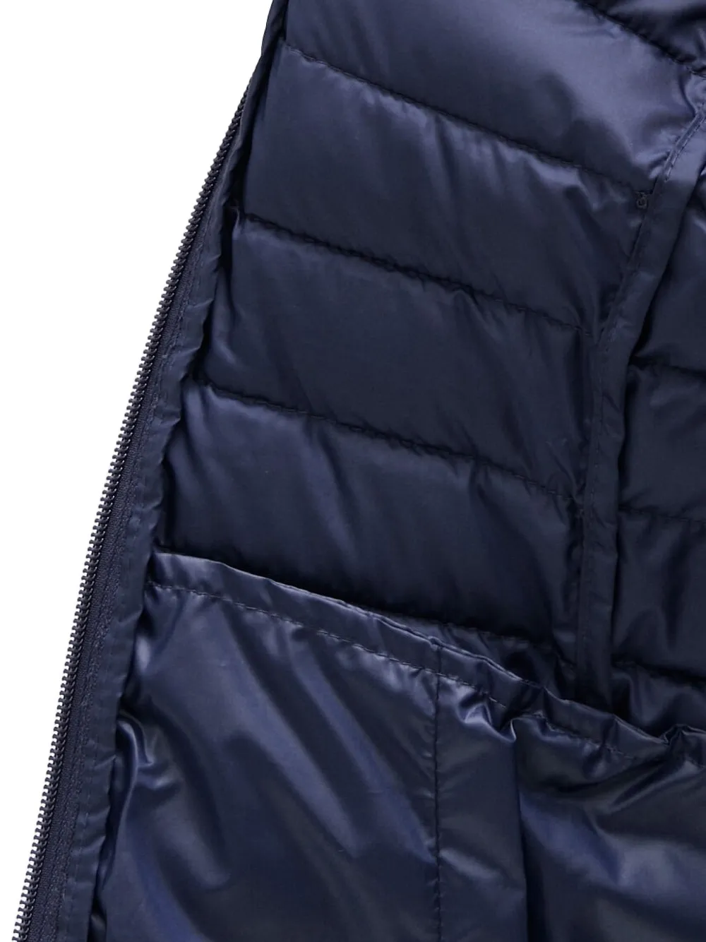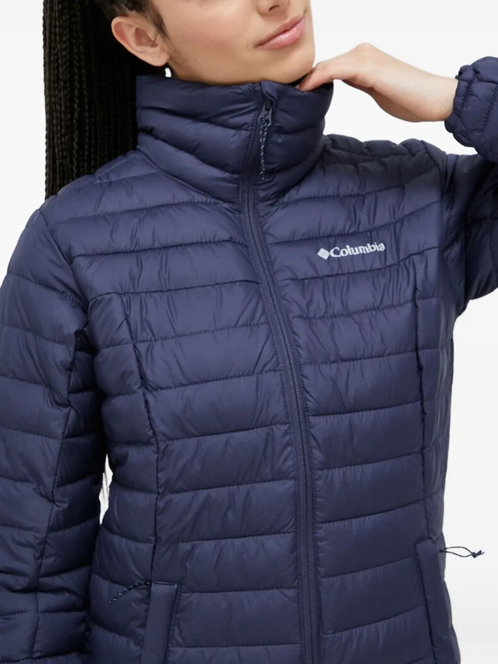 Темно-синяя стеганая конструкция, высокий ворот, застежка-молния, длинные рукава, боковые карманы.