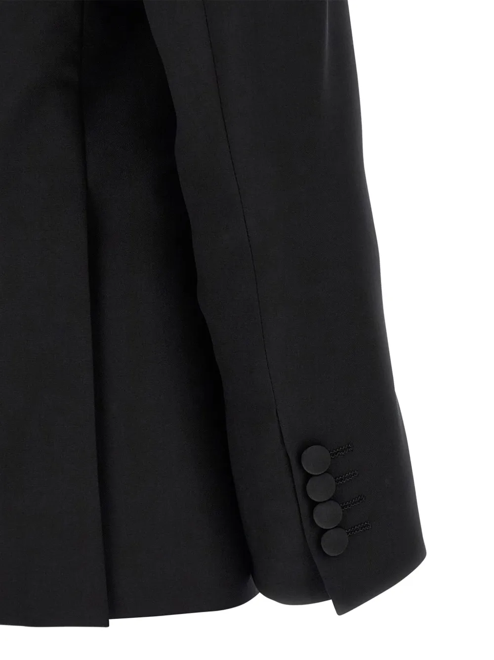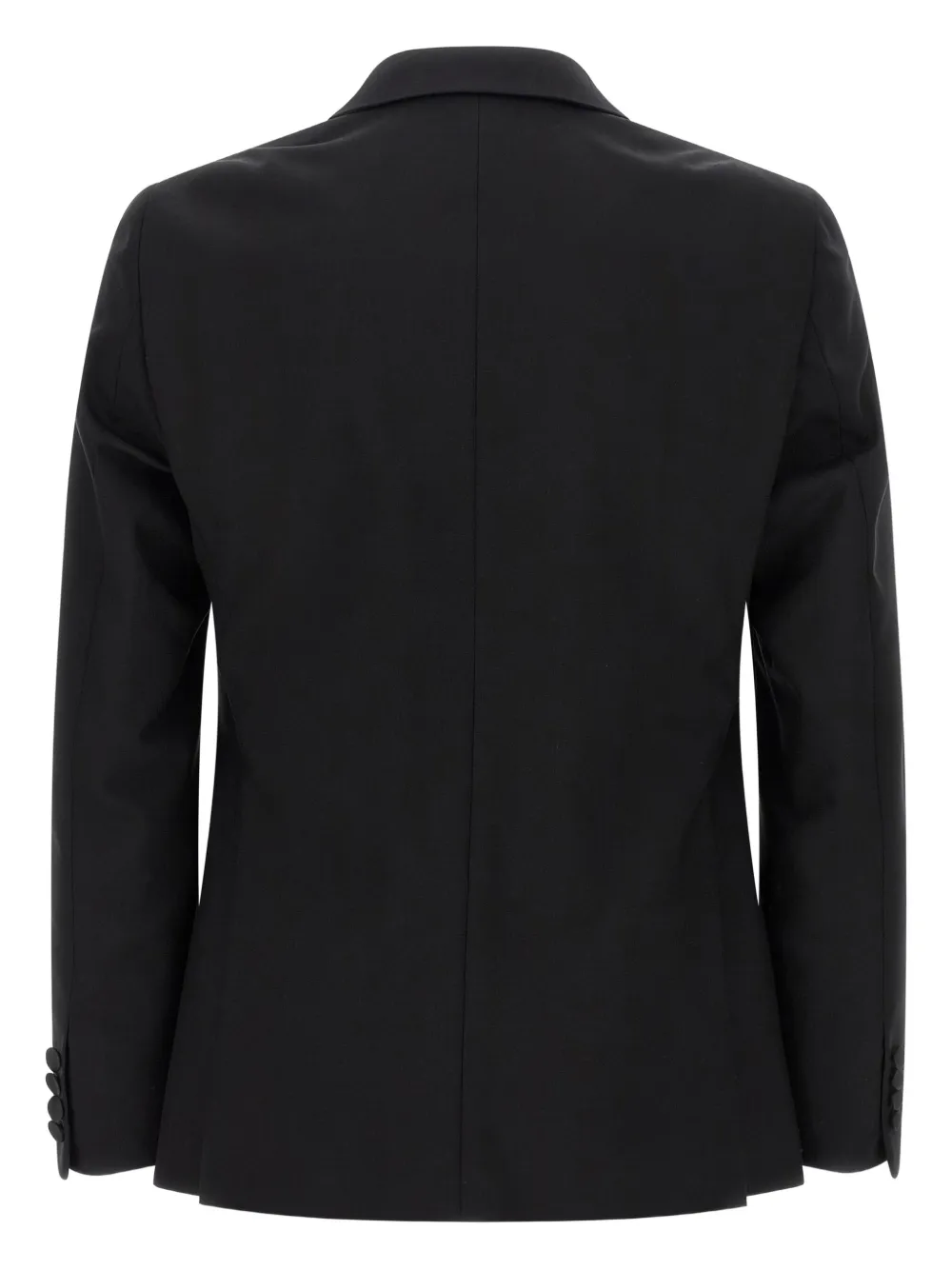 Черная шерсть, заостренные лацканы, прорезные карманы, застежка на пуговицы, шлевки для ремня.