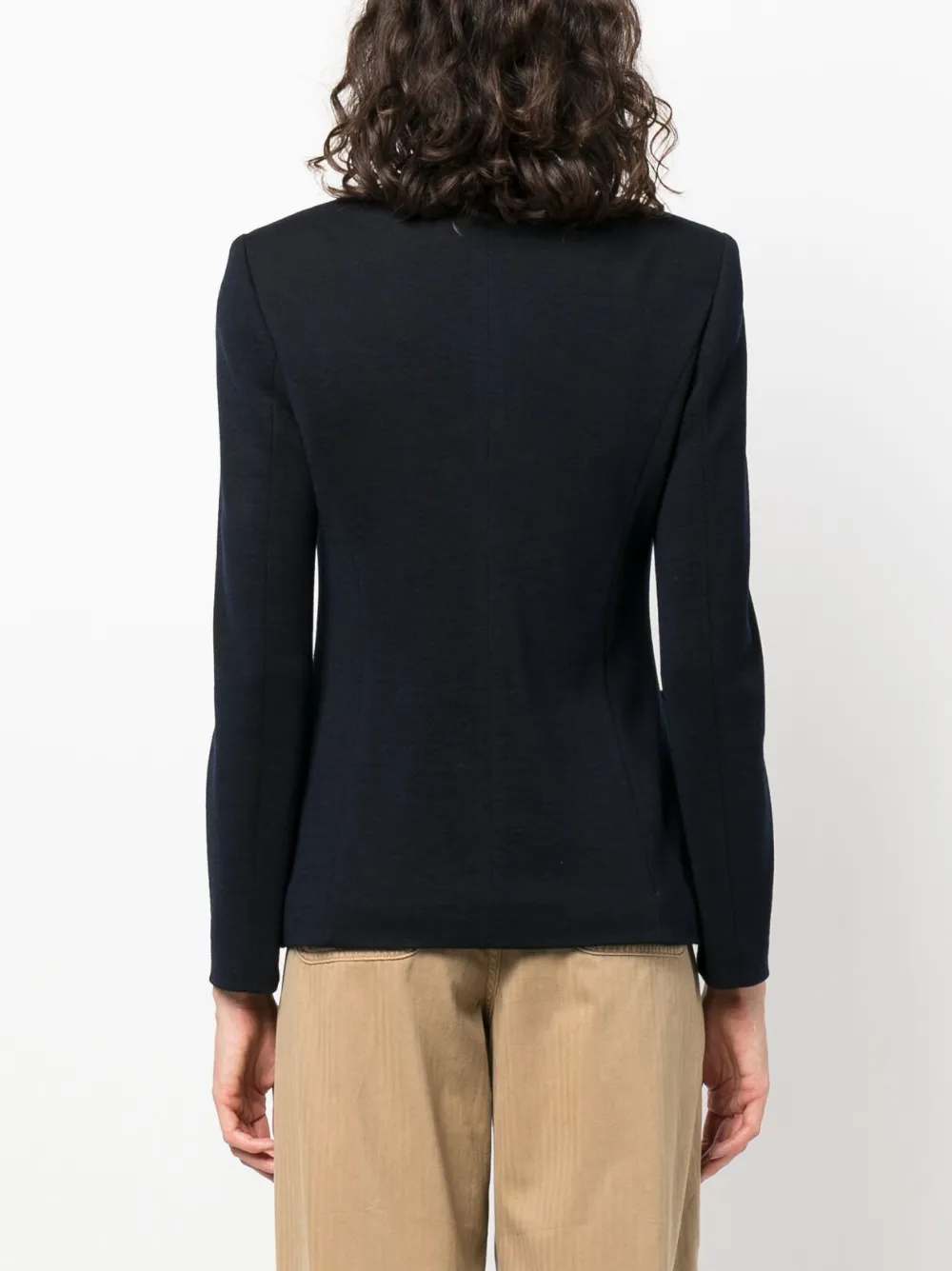 Темно-синий, зазубренные лацканы, застежка на пуговицах спереди, два накладных кармана спереди, длинные рукава и прямой подол.