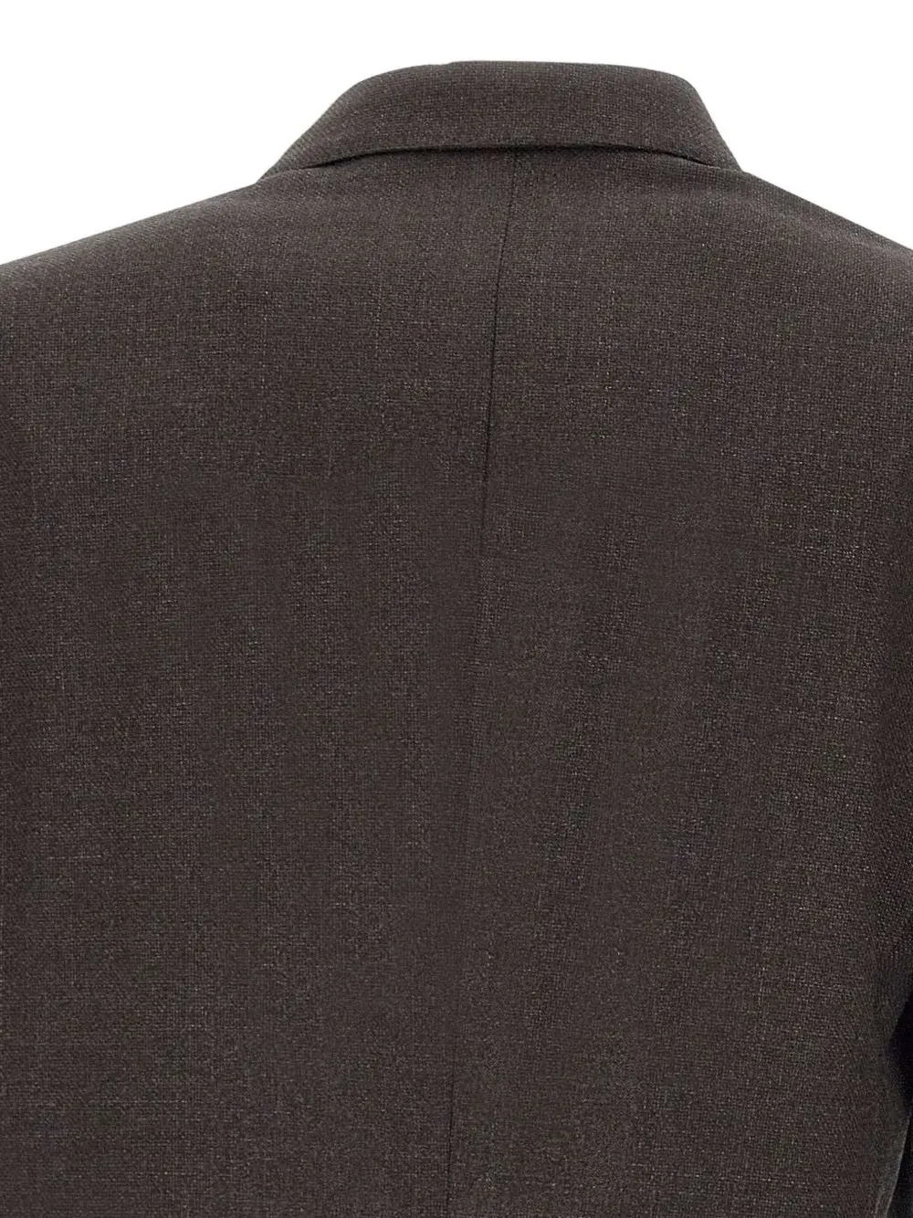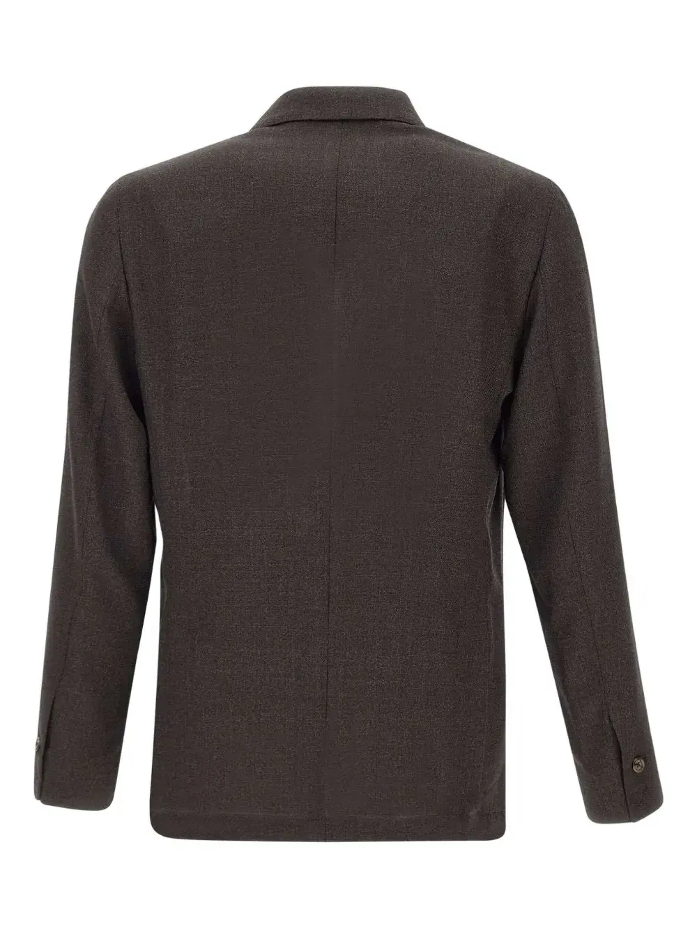 Коричневые зазубренные лацканы, застежка на пуговицы, передние карманы, застегивающиеся на пуговицы манжеты.