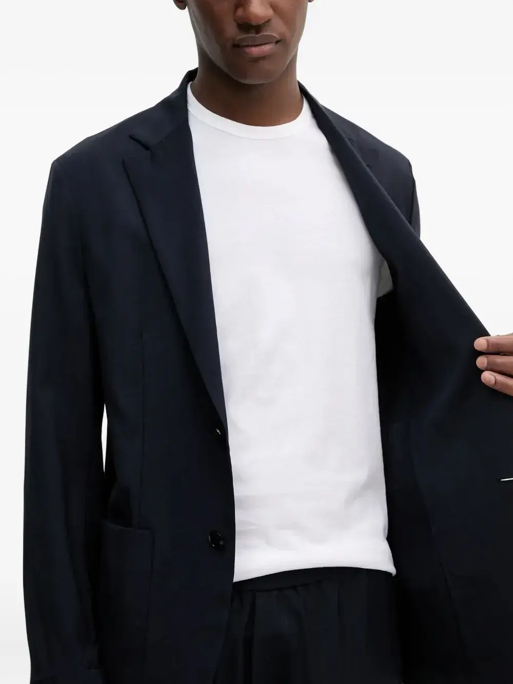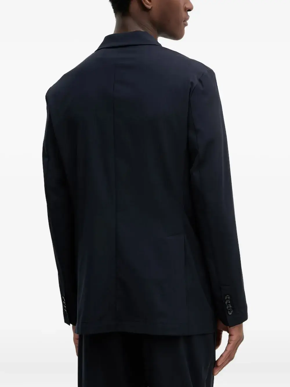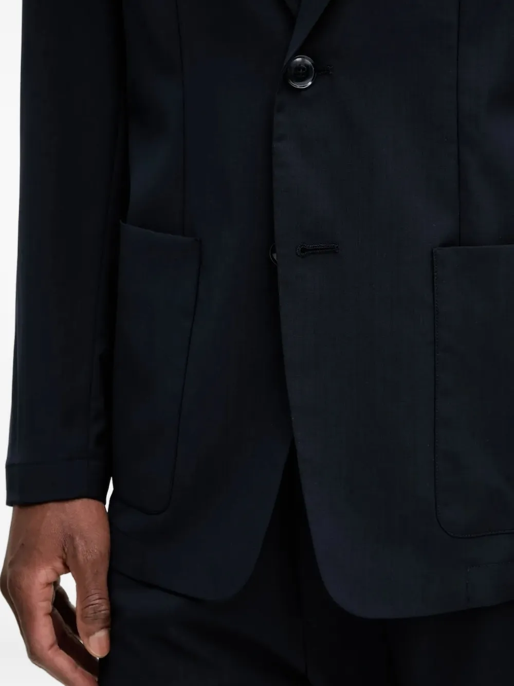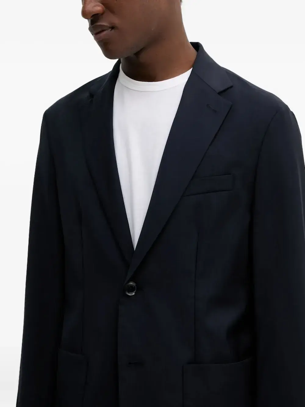 Застежка на синие пуговицы, однобортный накладной карман, отложной воротник, длинные рукава, прямой подол.