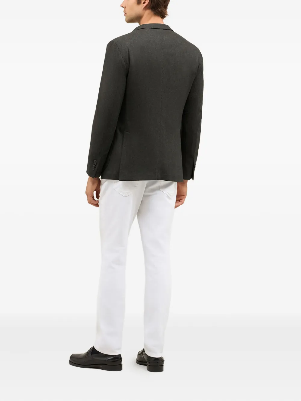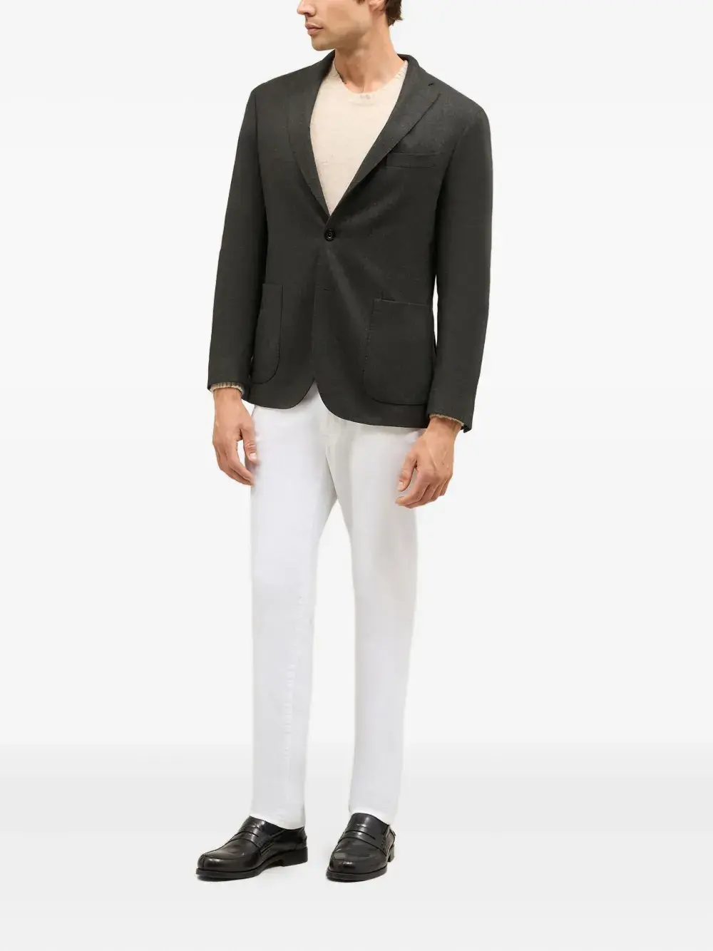 Темно-серый однобортный пиджак с застежкой на накладные карманы, застежка на пуговицы с зубчатыми лацканами
