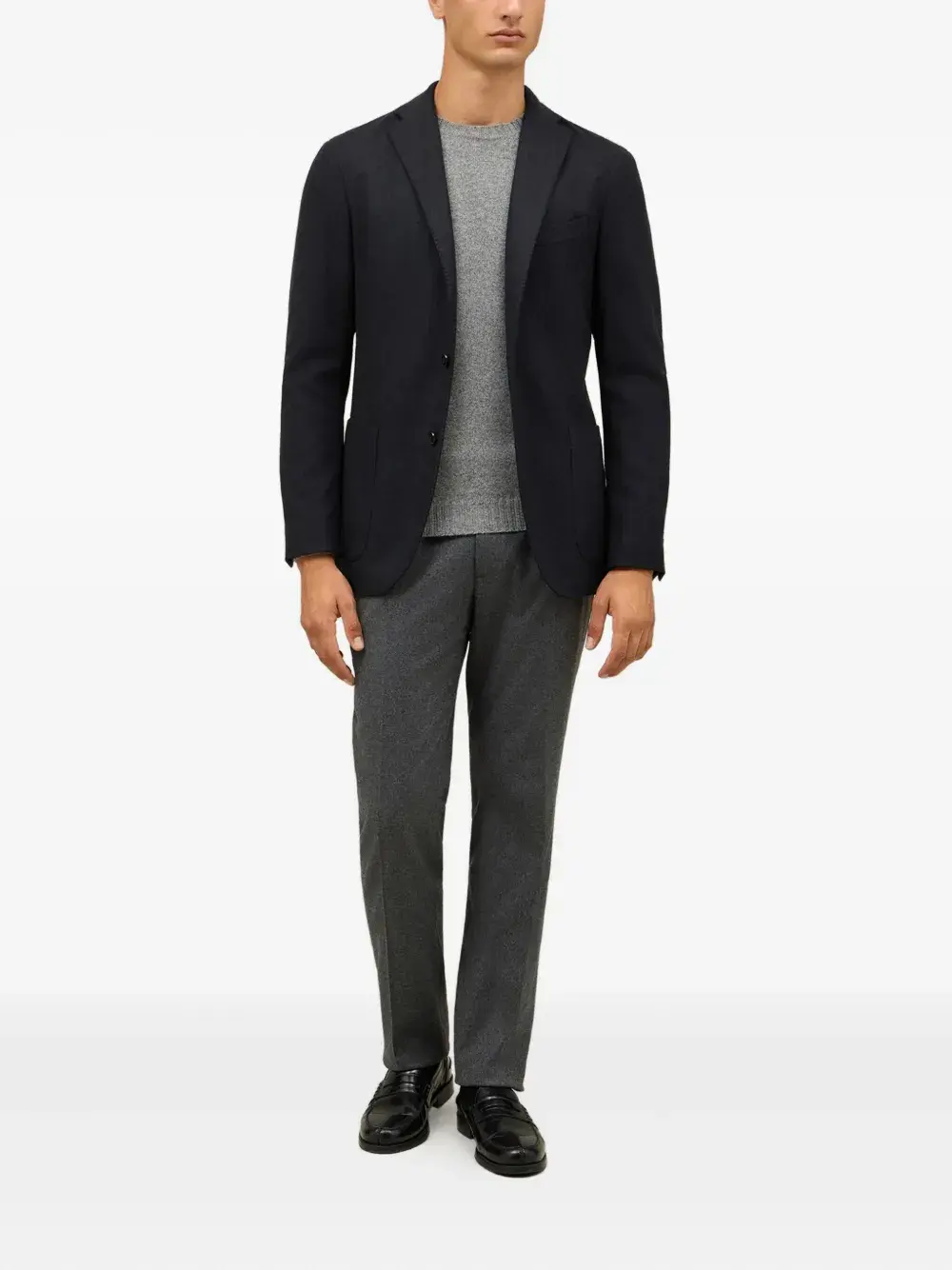 Темно-синяя застежка на две пуговицы, накладные карманы, отложные лацканы, длинные рукава.