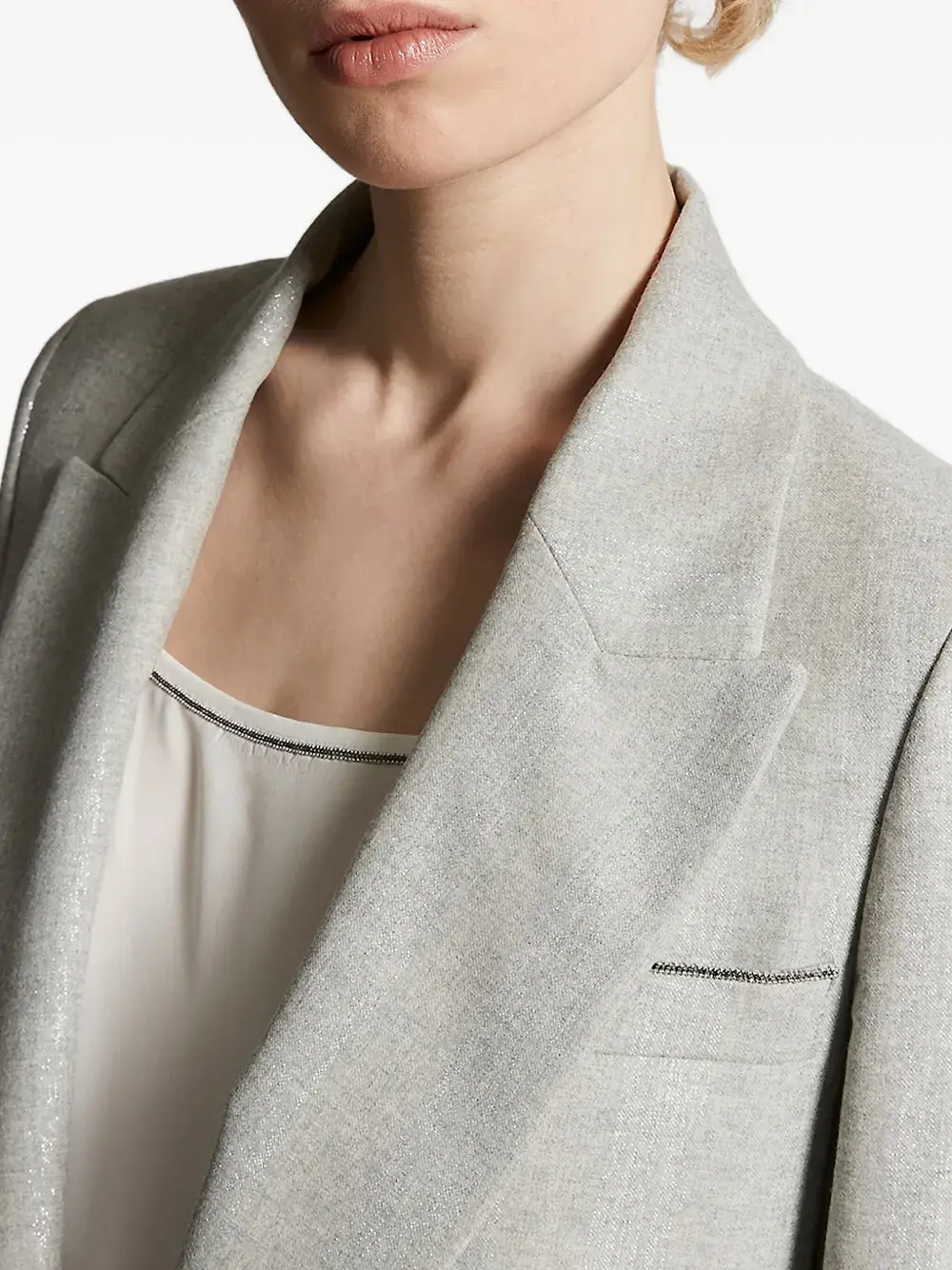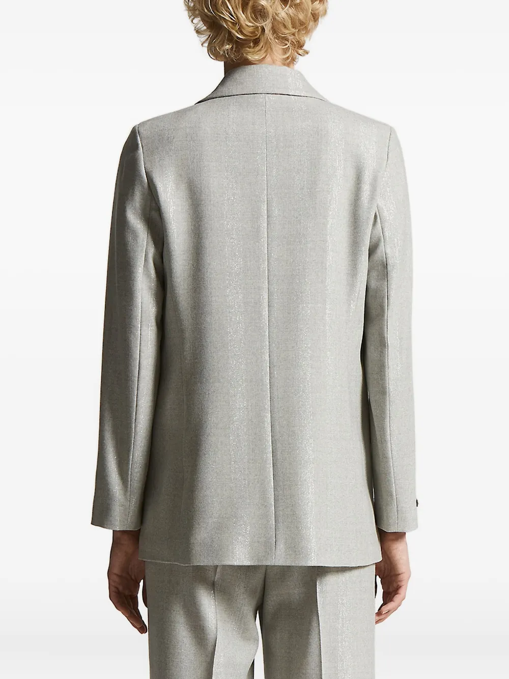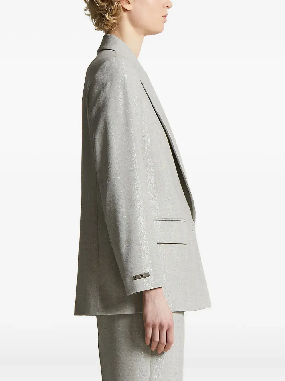 Серый однобортный пиджак с заостренными лацканами, застежкой на прорезные карманы, длинными рукавами.