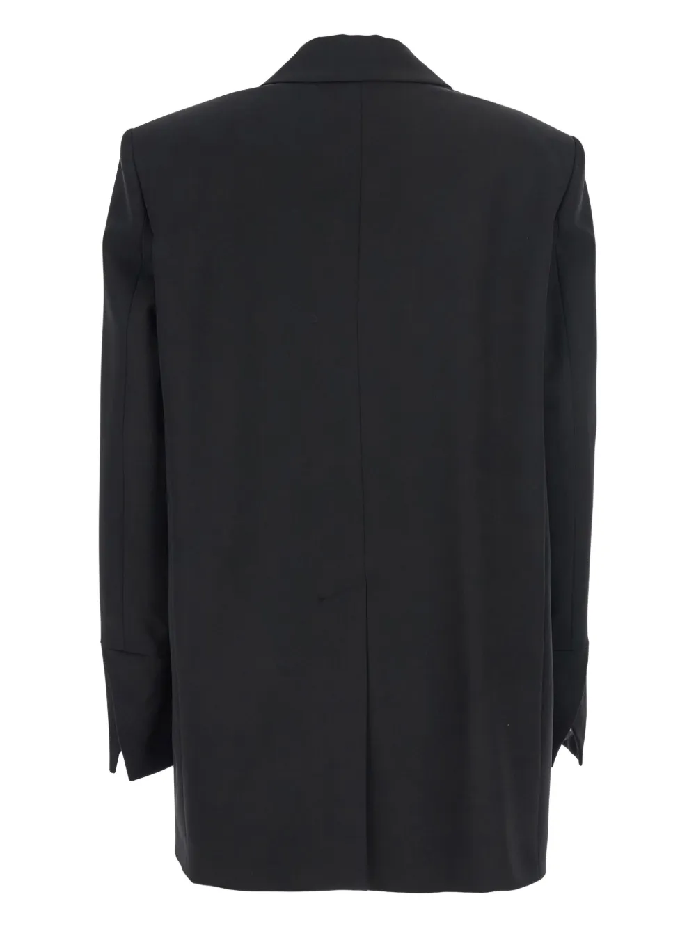 Черный однобортный пиджак с застежкой на пуговицы, отложным воротником, длинными рукавами и карманами с клапанами.
