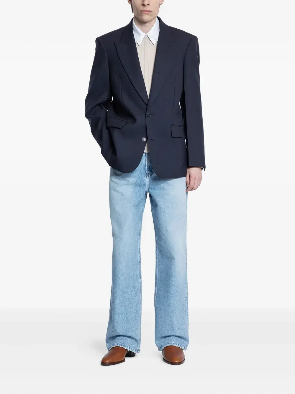Однобортный пиджак с заостренными лацканами, застегивающийся на пуговицы темно-синего цвета