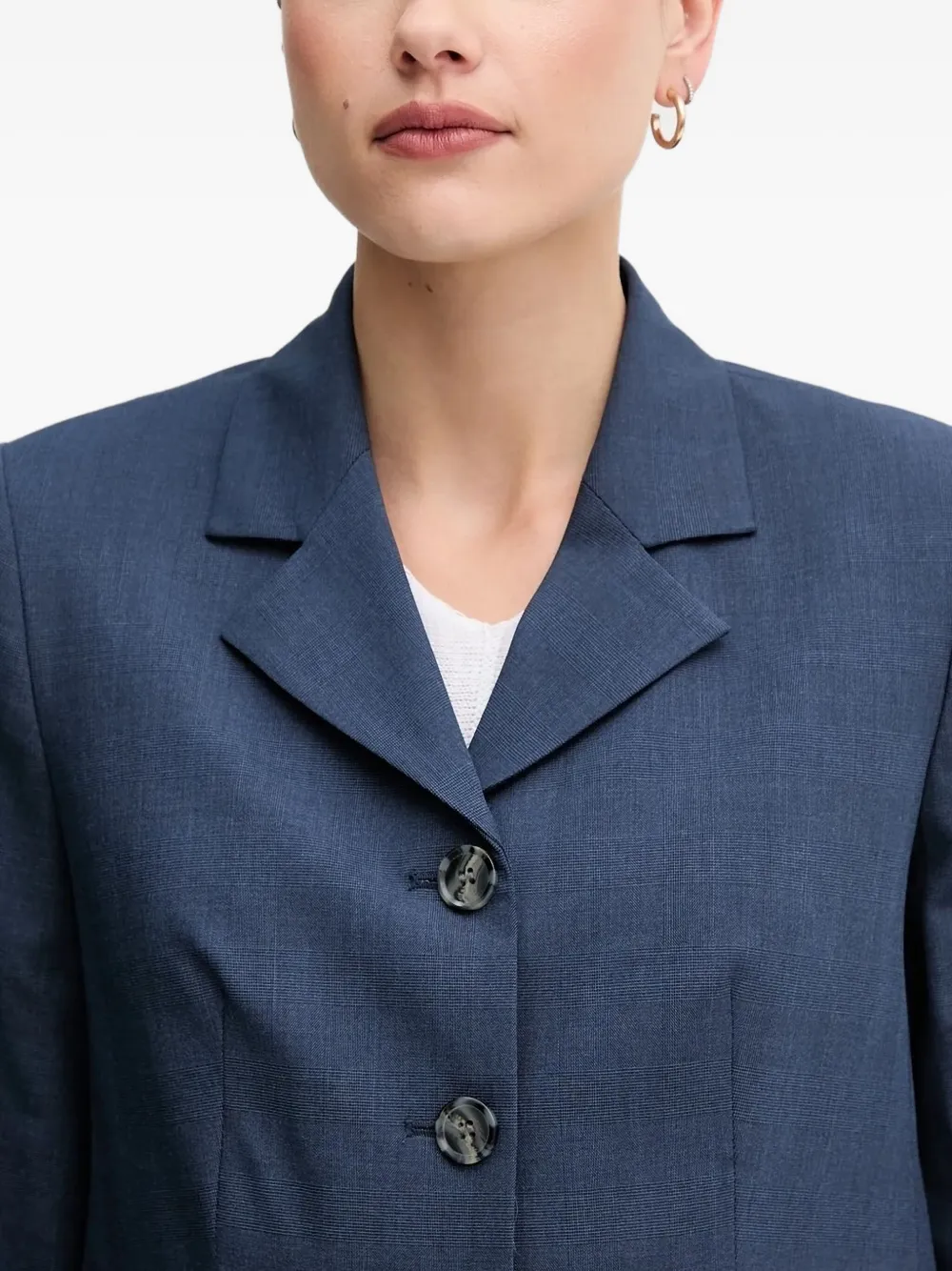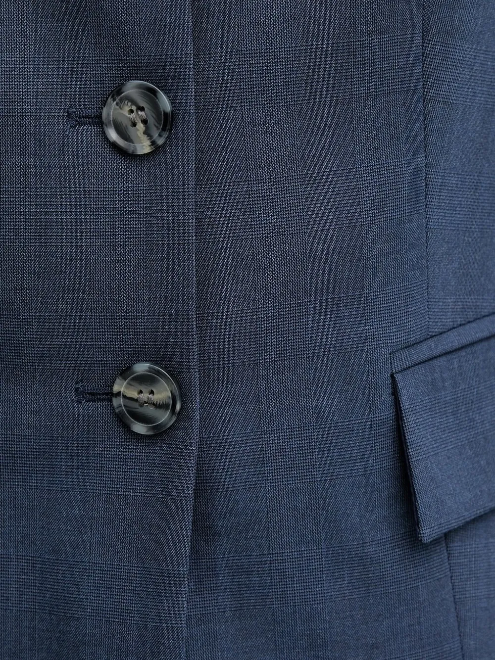 Застежка на пуговицы синего цвета, отложной воротник, прямой подол.