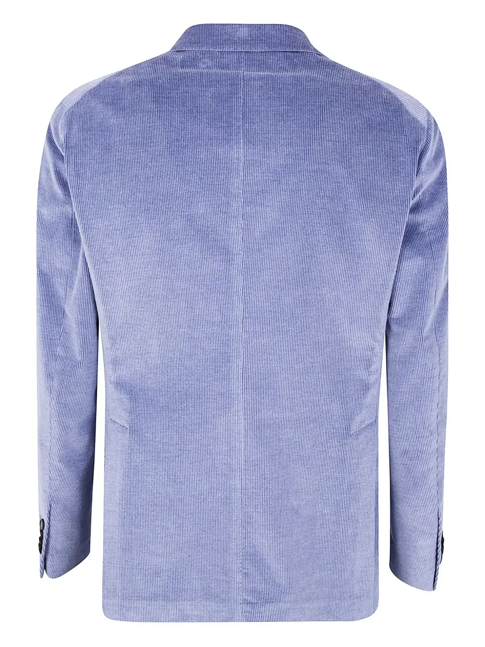 Синий однобортный пиджак с застежкой, накладными карманами и зазубренными лацканами.