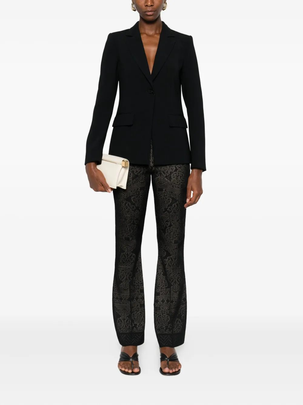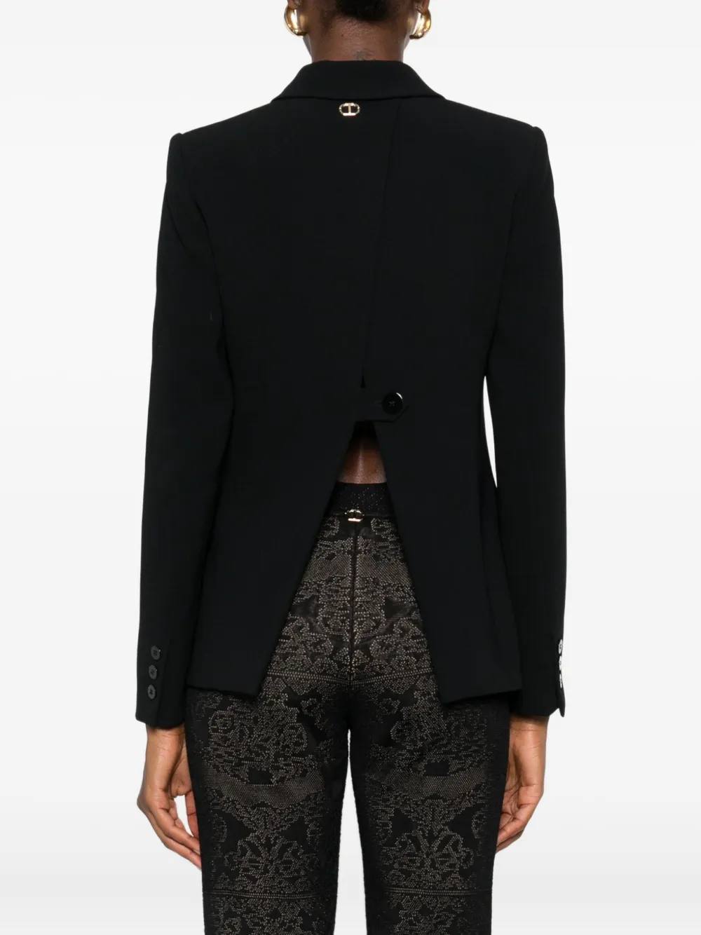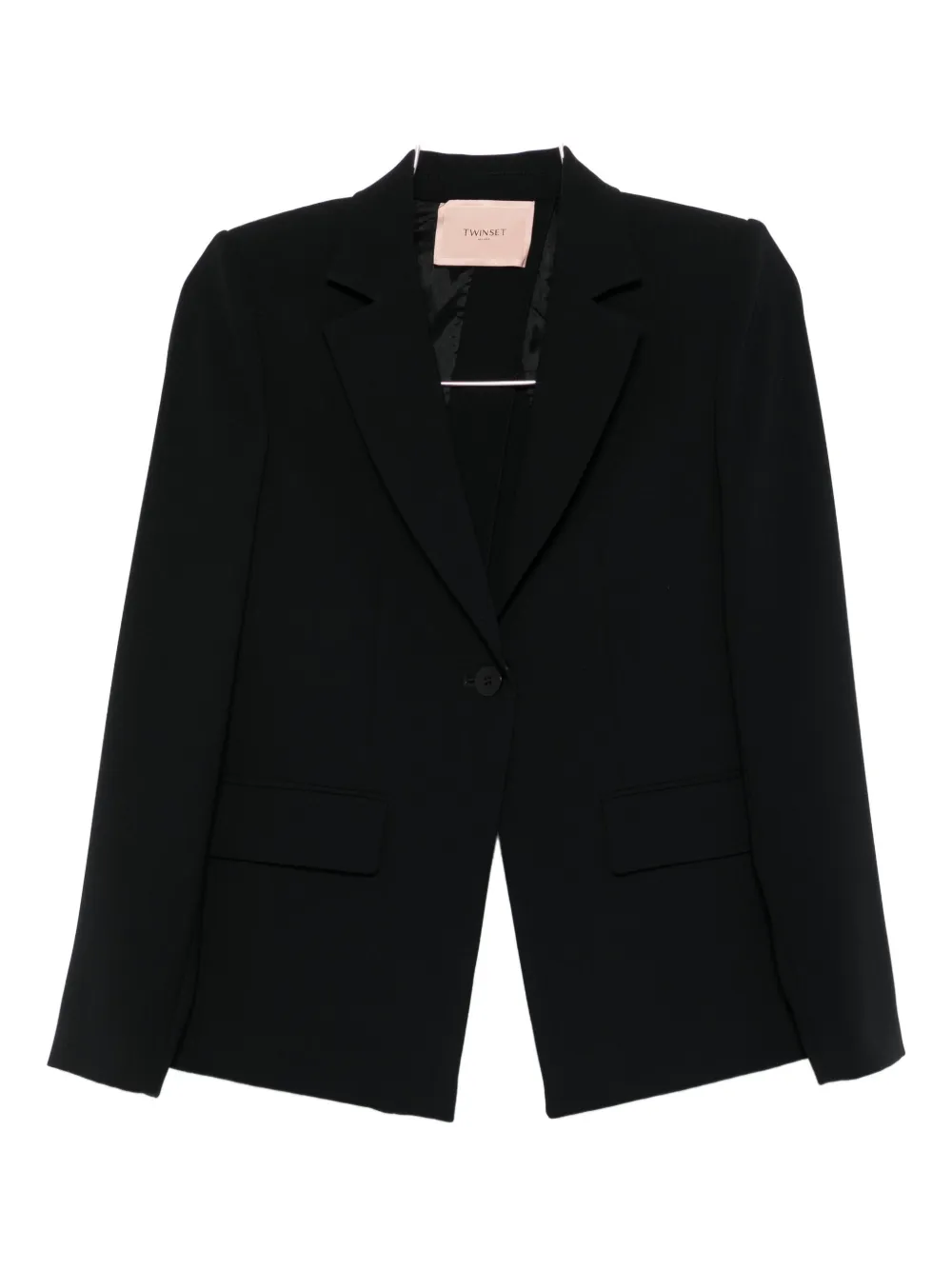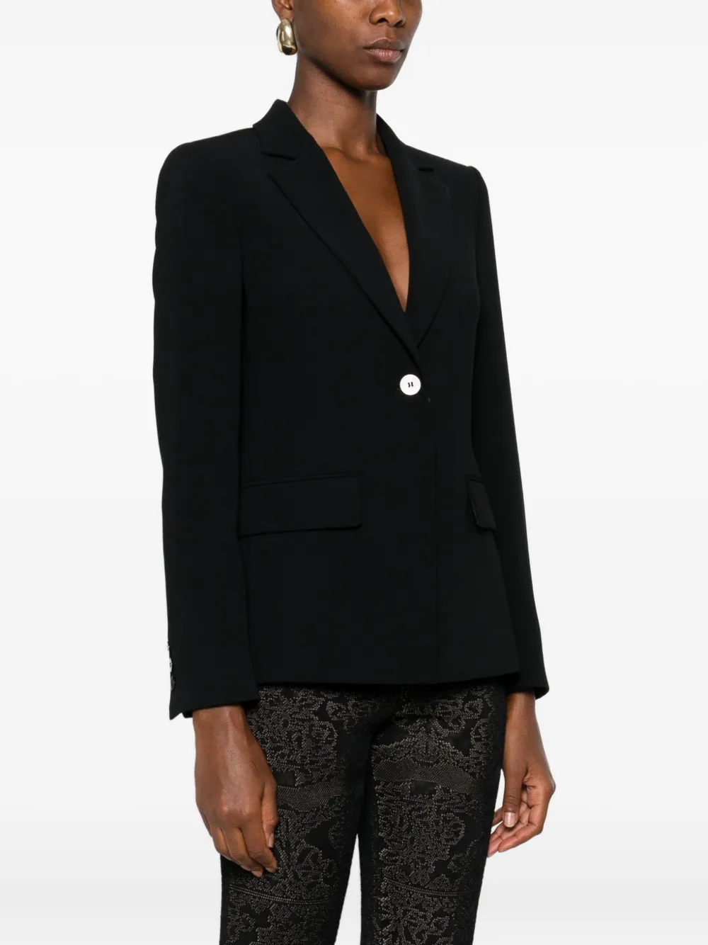 Черный однобортный пиджак с застежкой на лацкан и длинными рукавами.