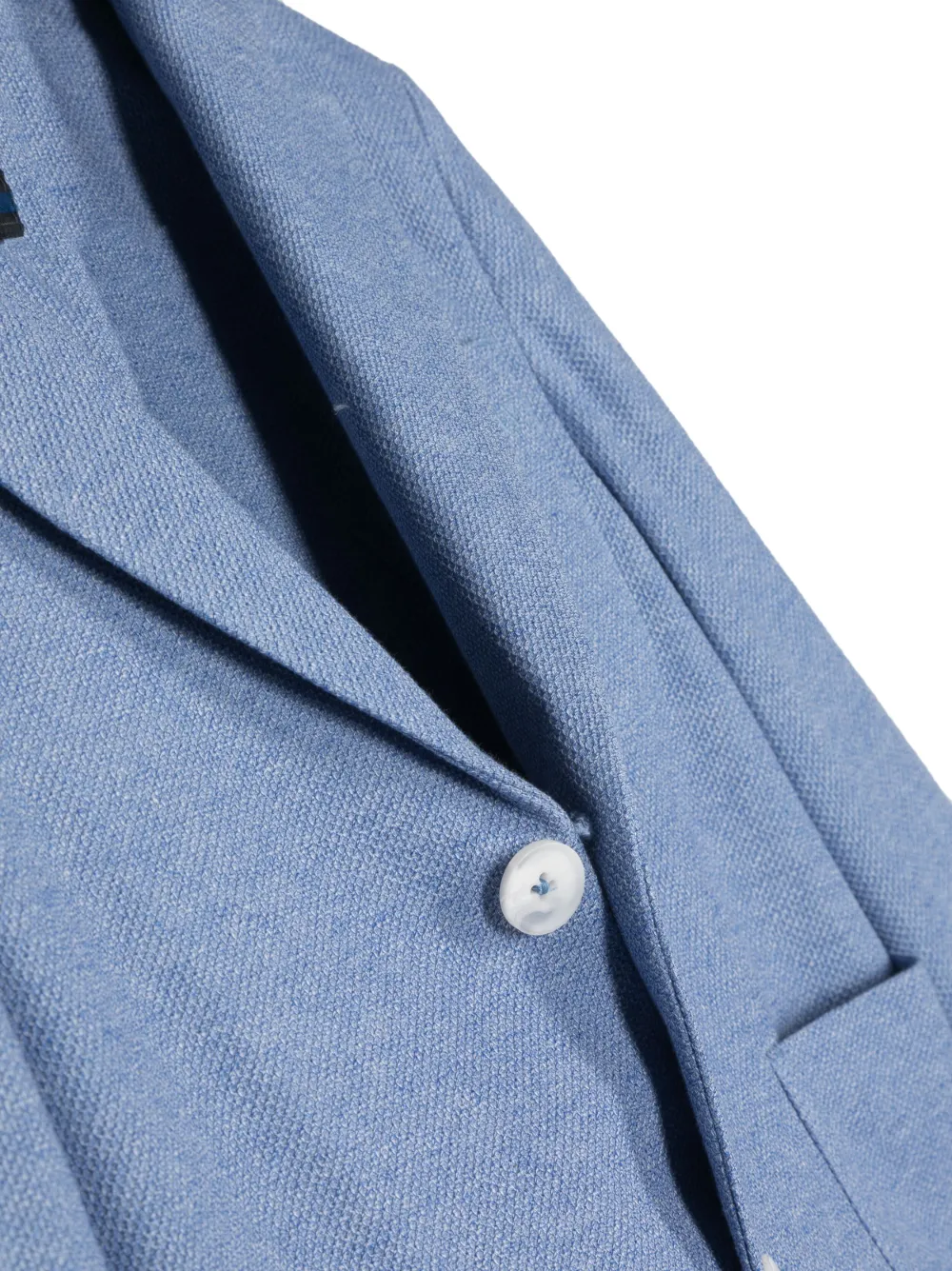 Васильковый, хлопок, классические лацканы, застежка на пуговицах спереди, нагрудный накладной карман, два накладных кармана и длинные рукава.