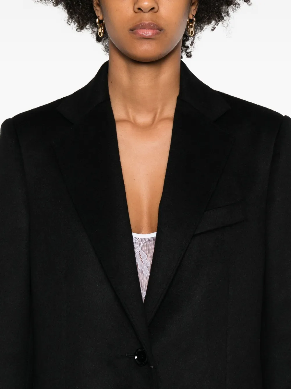 Черный V-образный вырез, застежка на пуговицы, отложной воротник, длинные рукава.