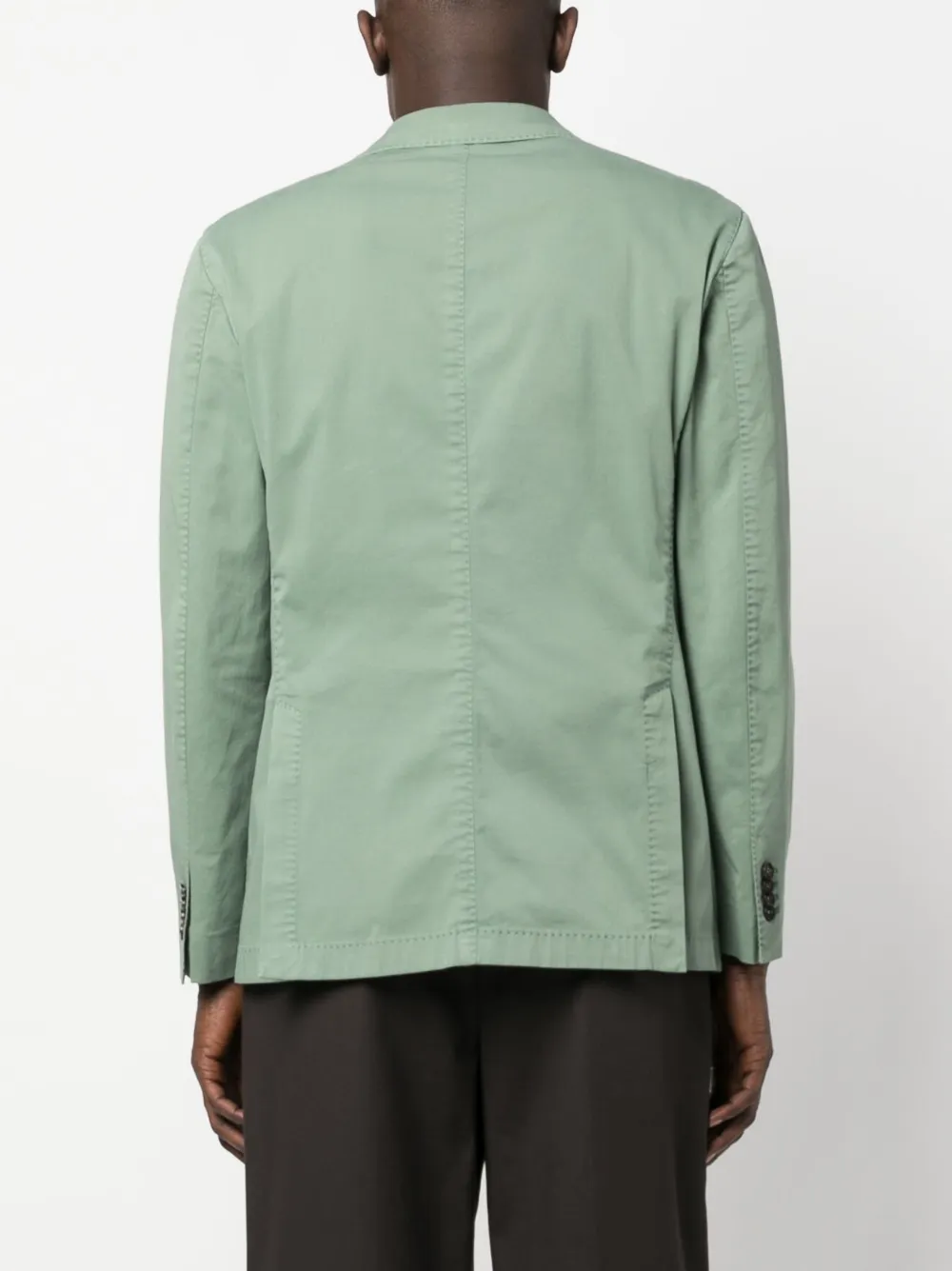 Светло-зеленый, эластичный хлопок, заостренные лацканы, длинные рукава, рукава с манжетами на пуговицах, застежка на пуговицах спереди, прорезной карман на груди, два накладных кармана по бокам и две боковые шлицы сзади.