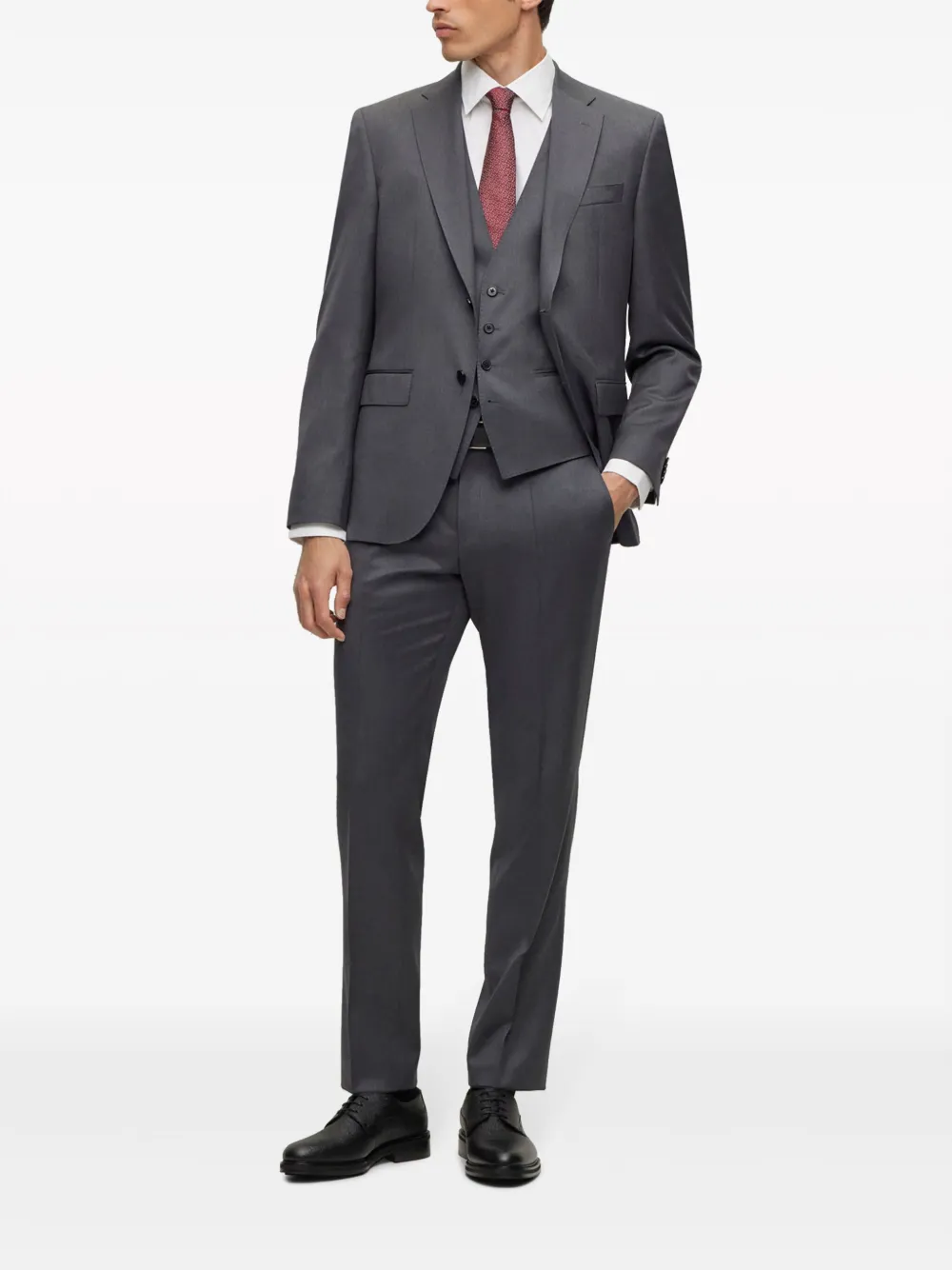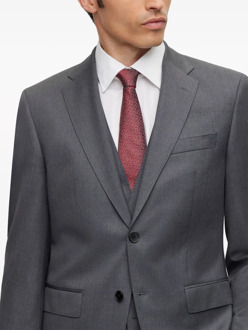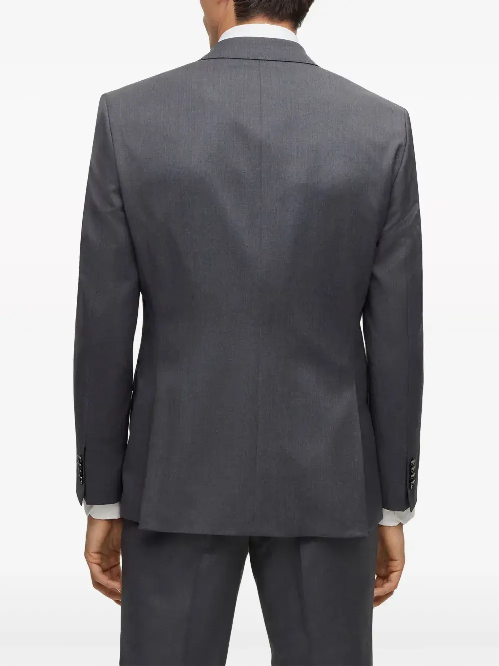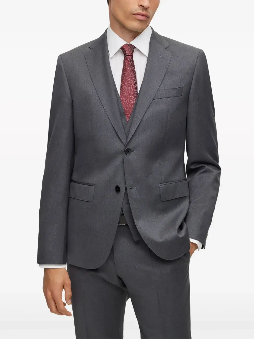 Серый, необработанная шерсть, классические лацканы, застежка на пуговицы, длинные рукава и два кармана с клапанами по бокам.