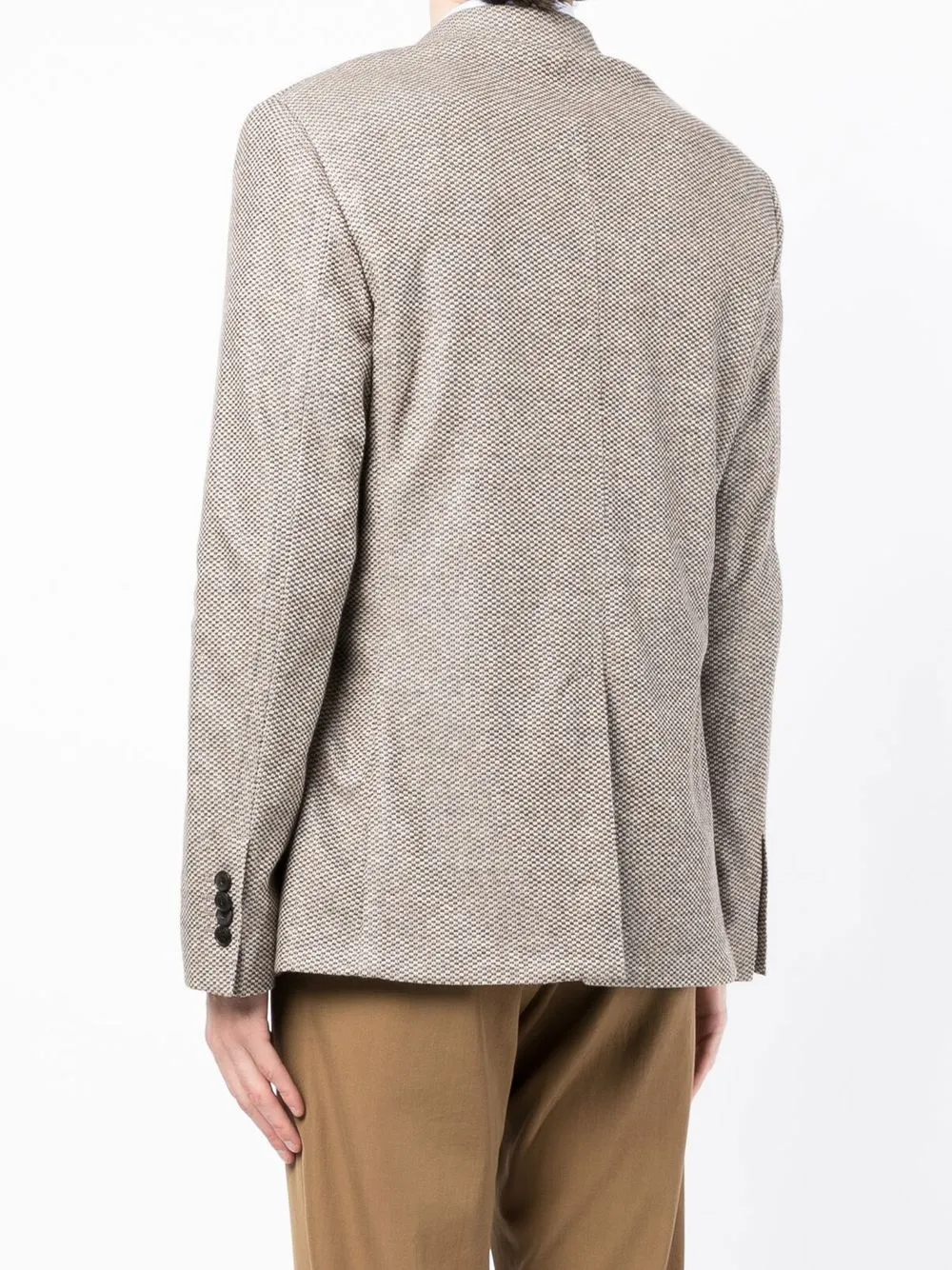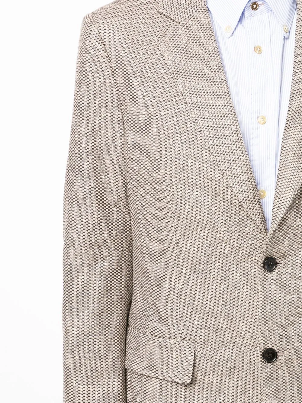 Коричневый, смесь хлопка и льна, зазубренные лацканы, застежка на пуговицах спереди, прорезной карман на груди, два кармана с клапанами по бокам, шлица по центру сзади, подплечники и длинные рукава.