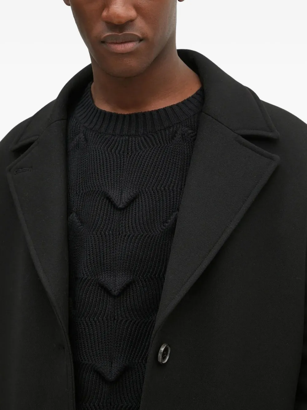 Черный однобортный пиджак с удлиненными карманами с клапанами, застежкой на пуговицы с зазубренными лацканами.