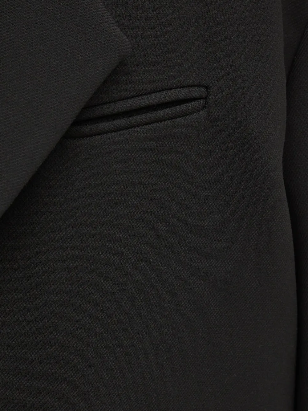 Черный однобортный пиджак с прорезными карманами, отложным воротником, длинными рукавами и застежкой на пуговицы.