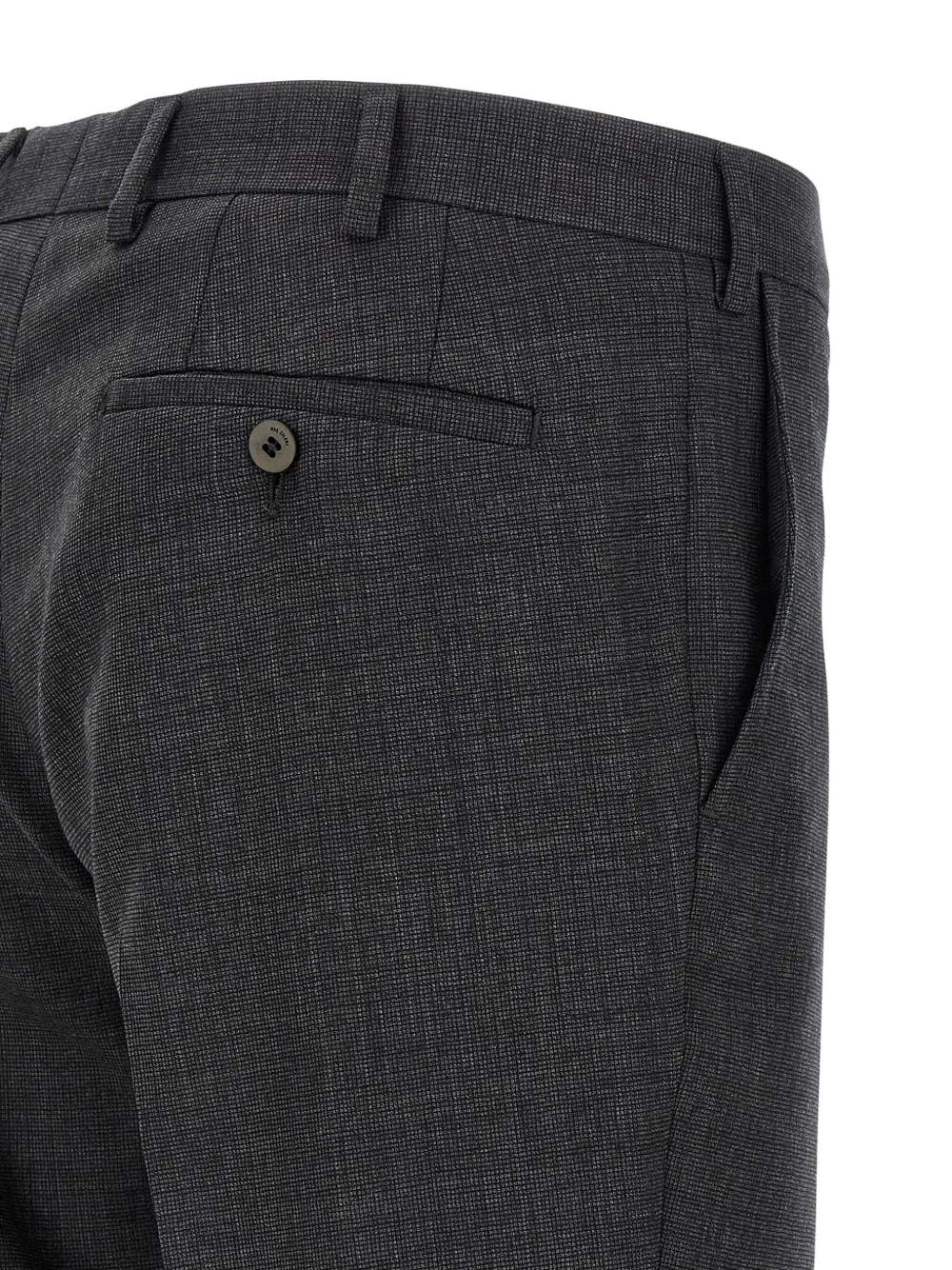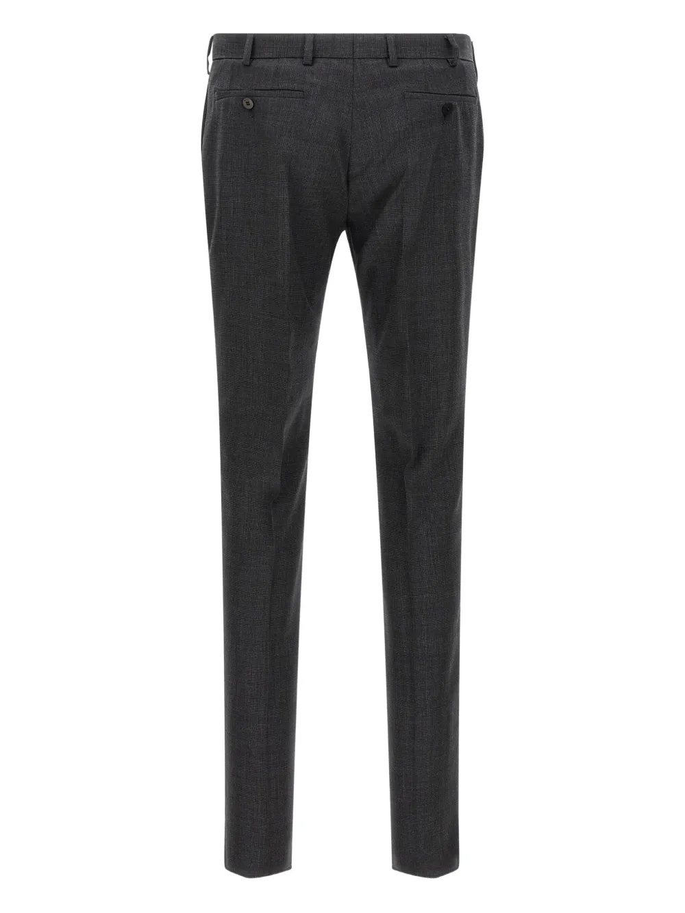 Серый однобортный пиджак с заостренными лацканами, карманами с клапанами, застежкой-молнией, шлевками для ремня, прорезными карманами.