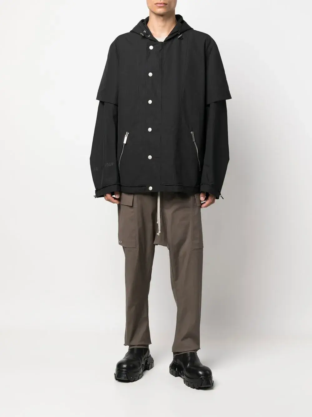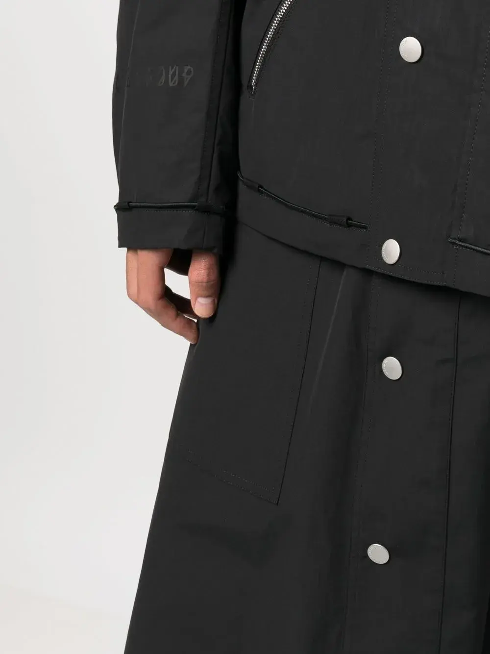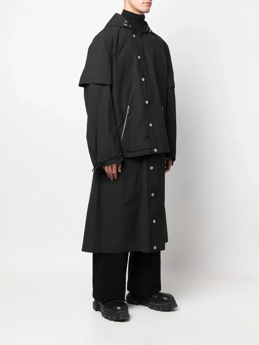 Черный, многослойный дизайн, классический капюшон, застежка на пуговицах спереди, два кармана на молнии по бокам, длинные рукава, шлица по центру сзади, закругленный подол и длина миди.