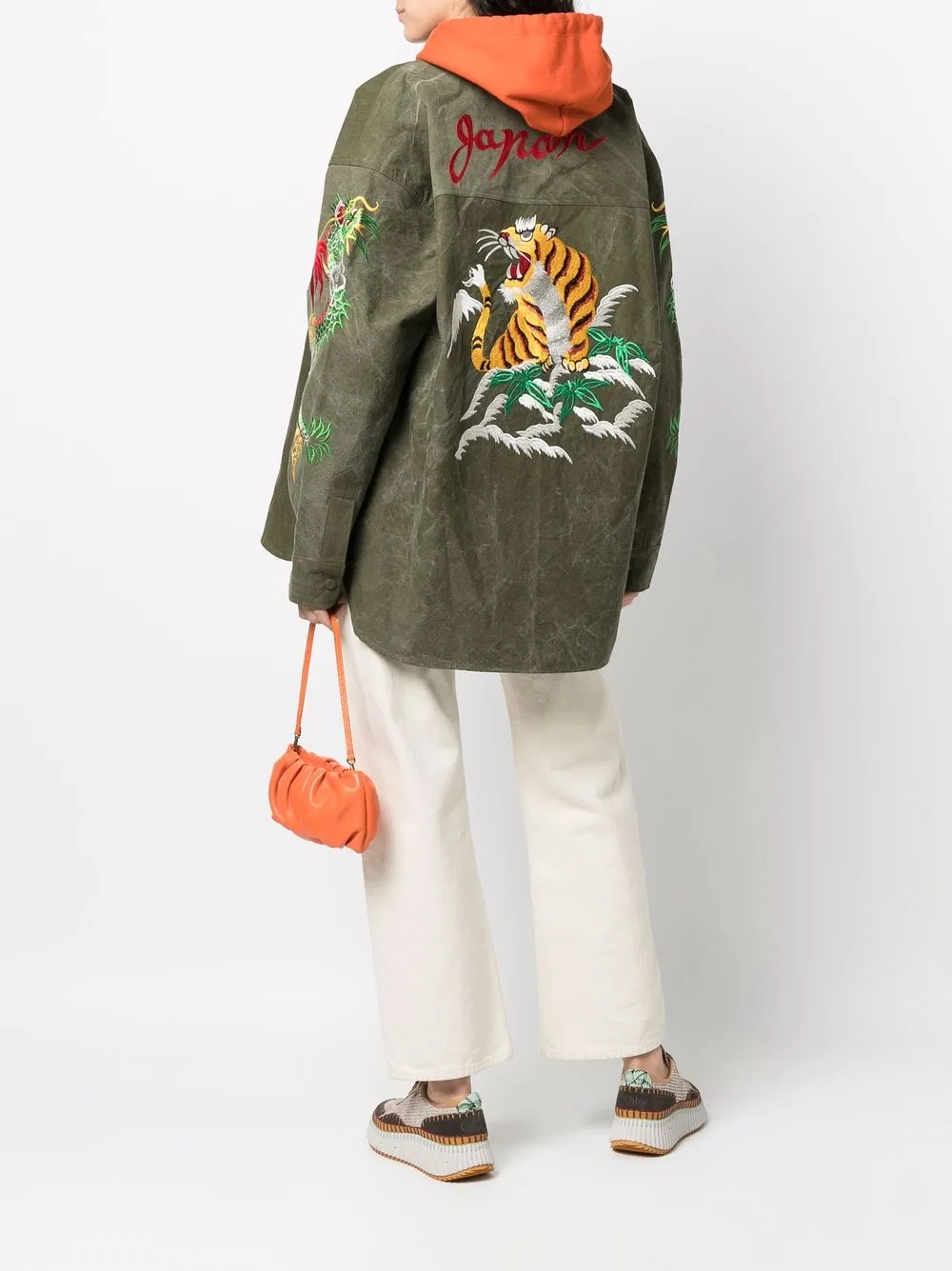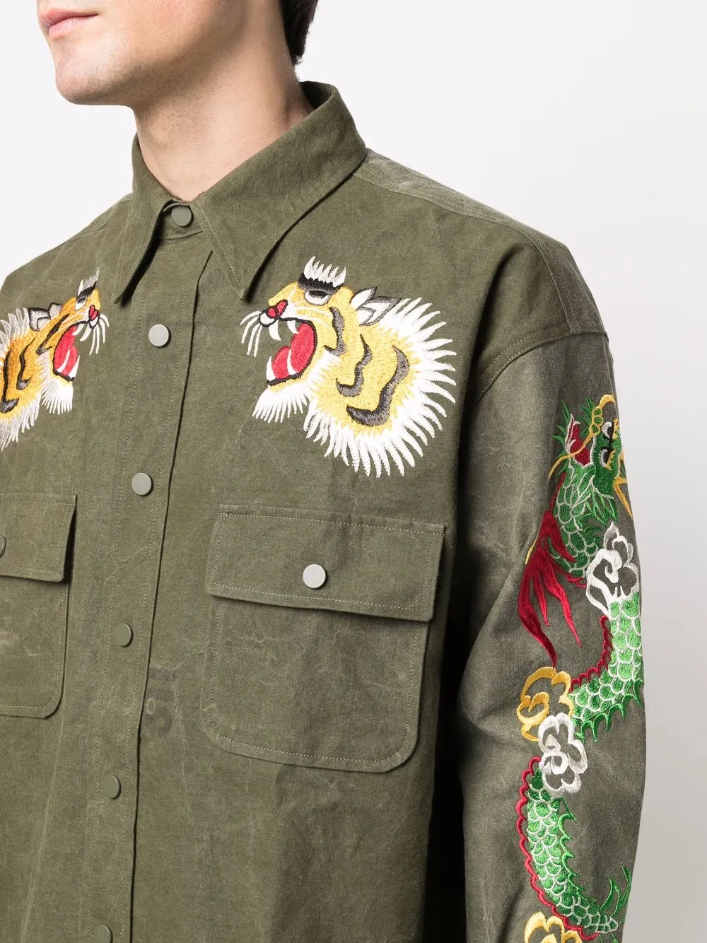 Вышивка, классический воротник, застежка на пуговицы, нагрудные карманы с клапаном и закругленный подол сзади.