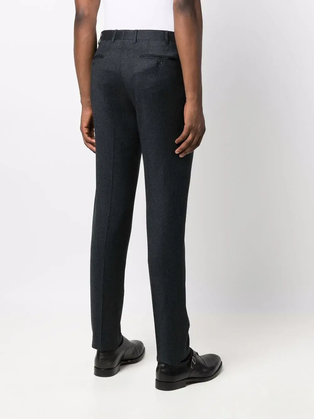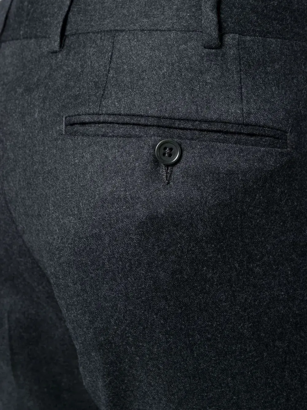 Узкий крой, петли для ремня, смещенная застежка на пуговицах спереди, два вшитых кармана по бокам и два кармана с листочкой сзади.