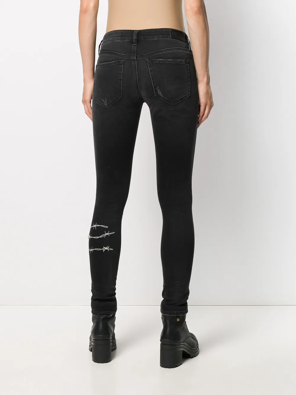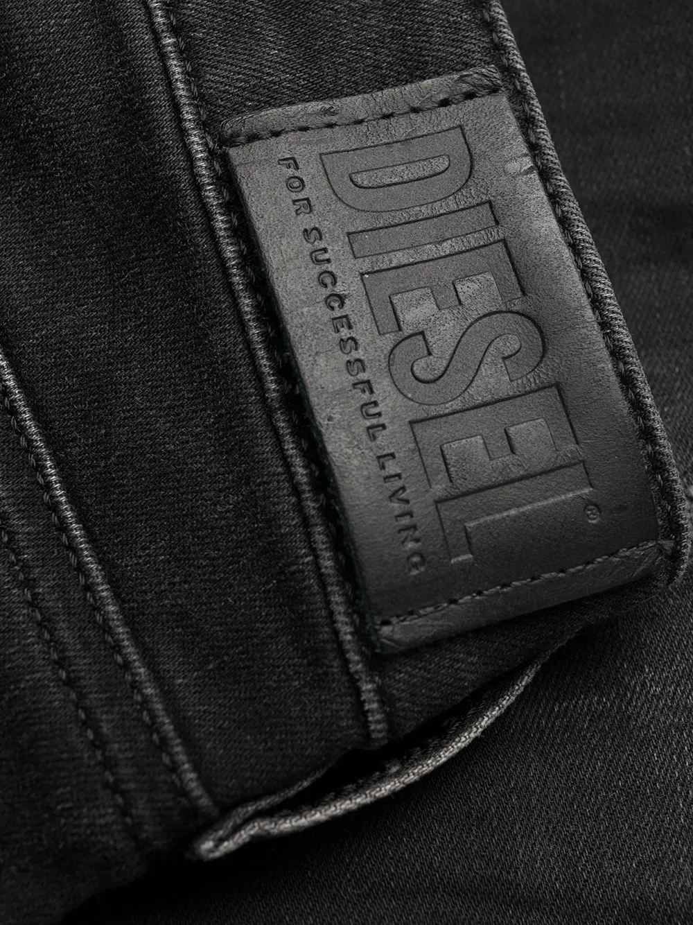 Джинсы скинни от Diesel (Дизель). Пояс с петлями для ремня, классическая пятикарманная модель, ширинка на молнии с пуговицей, эффект потертости и кожаная заплатка с логотипом сзади. Цвет: черный.