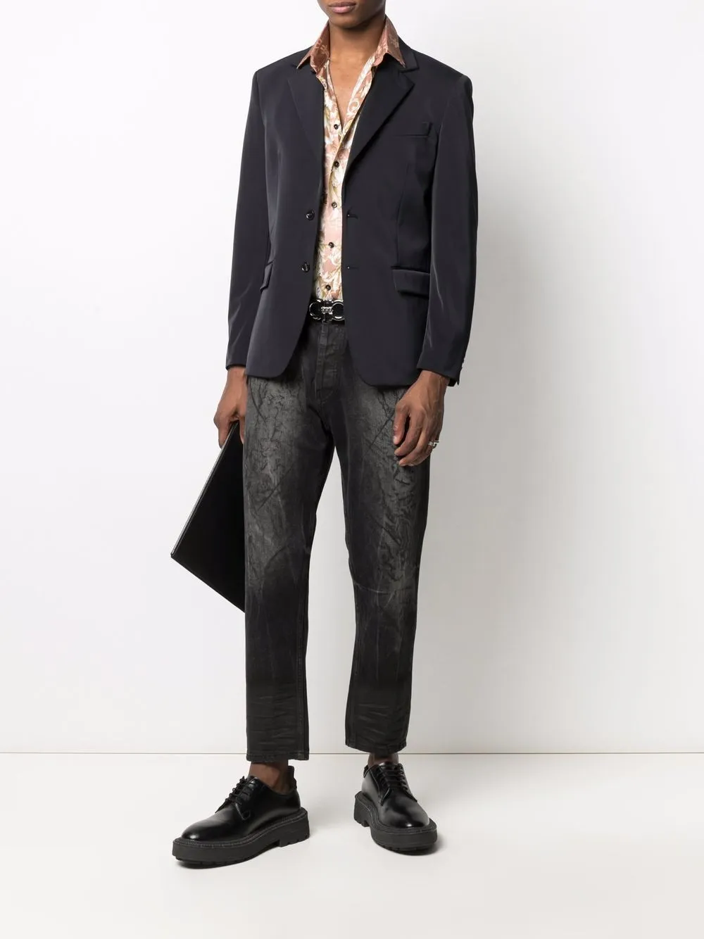 Эффект потертости, застежка на пуговицах спереди, два кармана по бокам и два накладных кармана сзади.