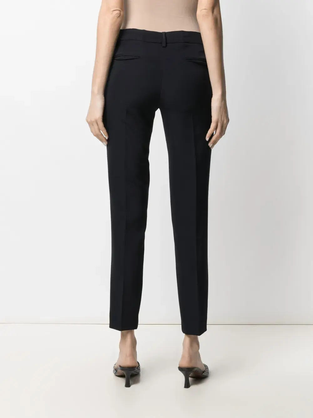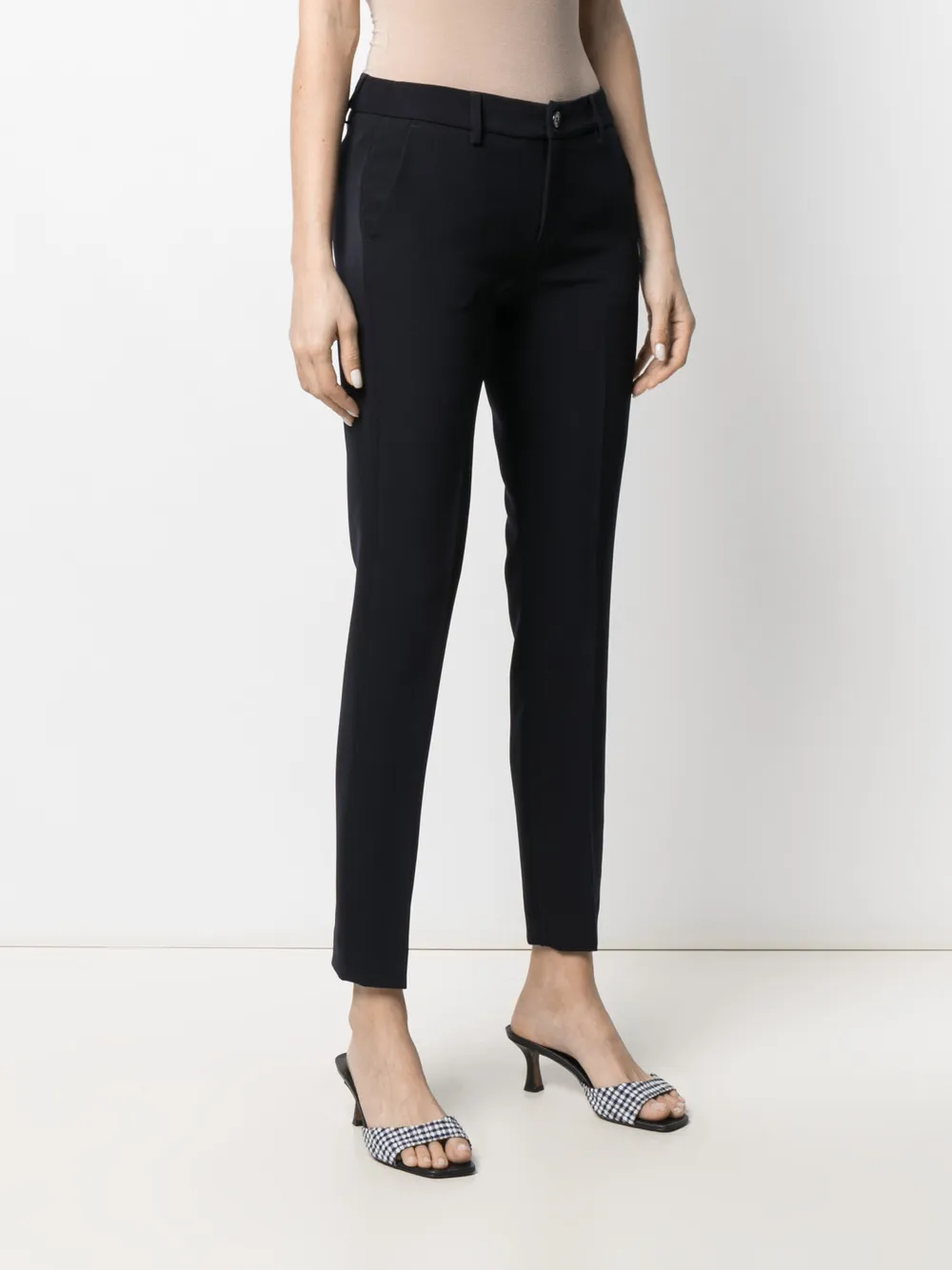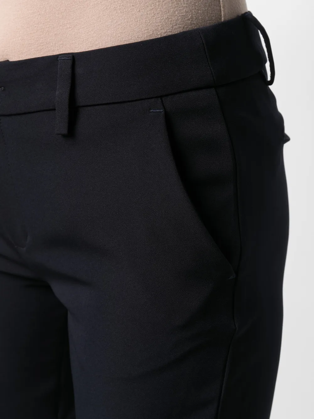 Ширинка на пуговицах, петли для ремня, два кармана с листочкой сзади и облегающий крой.