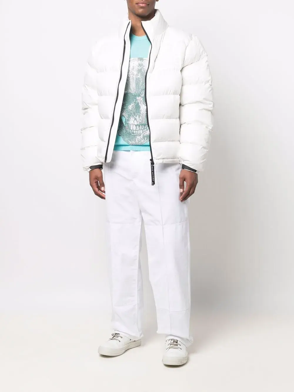 Принт с изображением черепа спереди, украшения из горного хрусталя, круглый вырез, длинные рукава, прямой подол и отделка в рубчик.