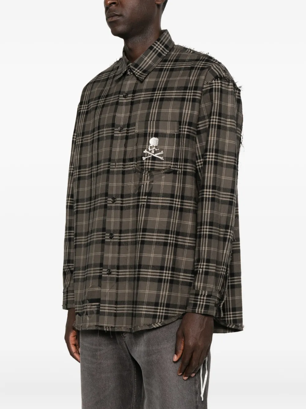 Коричневый клетчатый узор с вышитым мотивом черепа, застежка на пуговицы, длинные рукава.