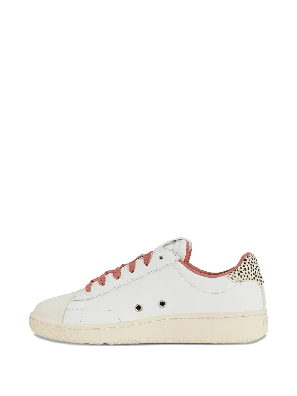 Белый каблук с далматинским рисунком, кожаный верх, плоские шнурки, кремовая подошва, замшевый задник.