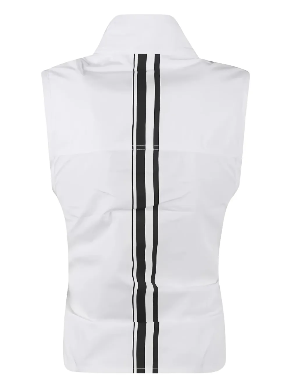 Белый фасон без рукавов, воротник-стойка, завязка на завязке, центральная полоска сзади, прямой подол
