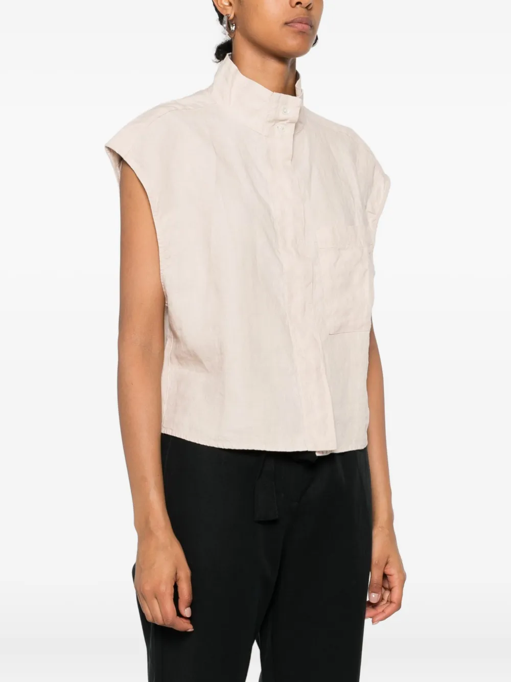 Бежевый льняной скрытый крой, высокий ворот, без рукавов, накладной карман