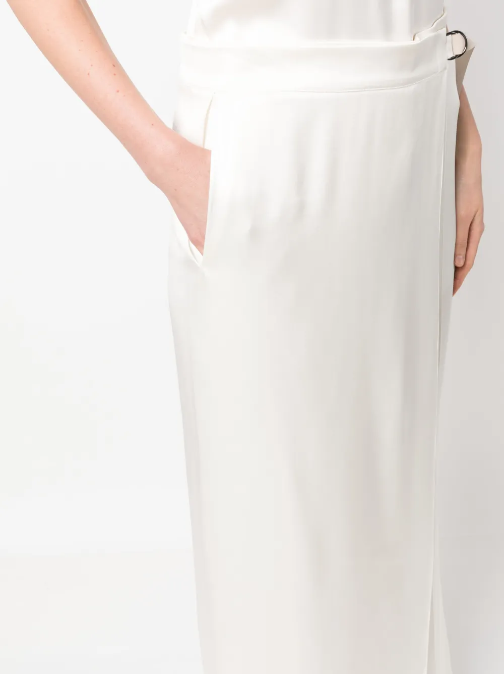 Цвет слоновой кости, шелковый атлас, многослойный дизайн, U-образный вырез, вырез рейсер, без рукавов, стрелки и расклешенный подол.