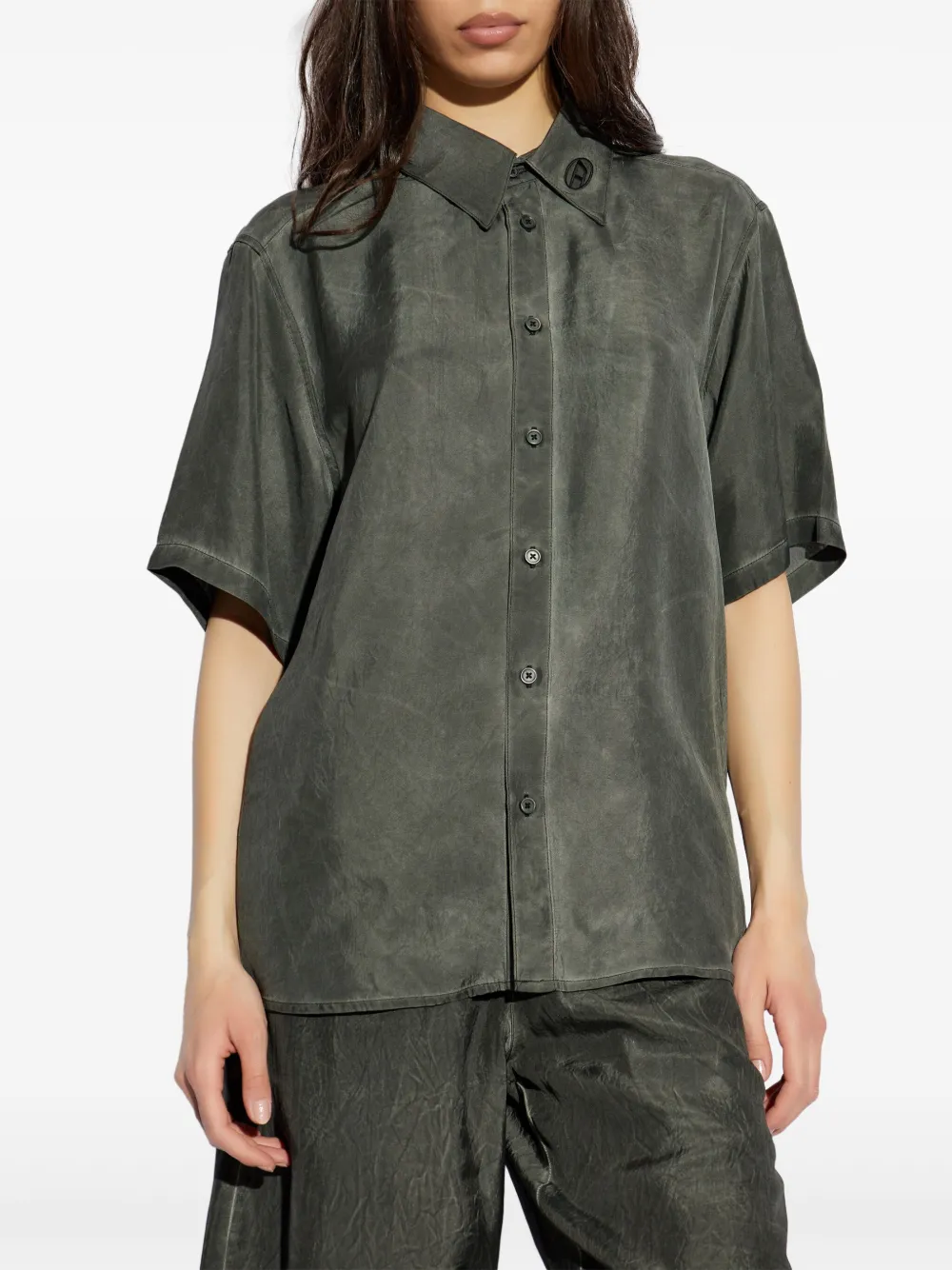 Застежка на зеленую пуговицу, классический воротник, короткие рукава, вышитый логотип на воротнике.
