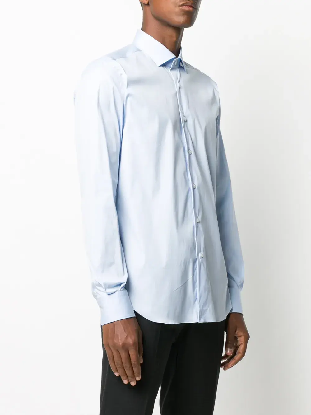 Классический воротник, планка на пуговицах спереди, длинные рукава, манжеты на пуговицах и закругленный подол.