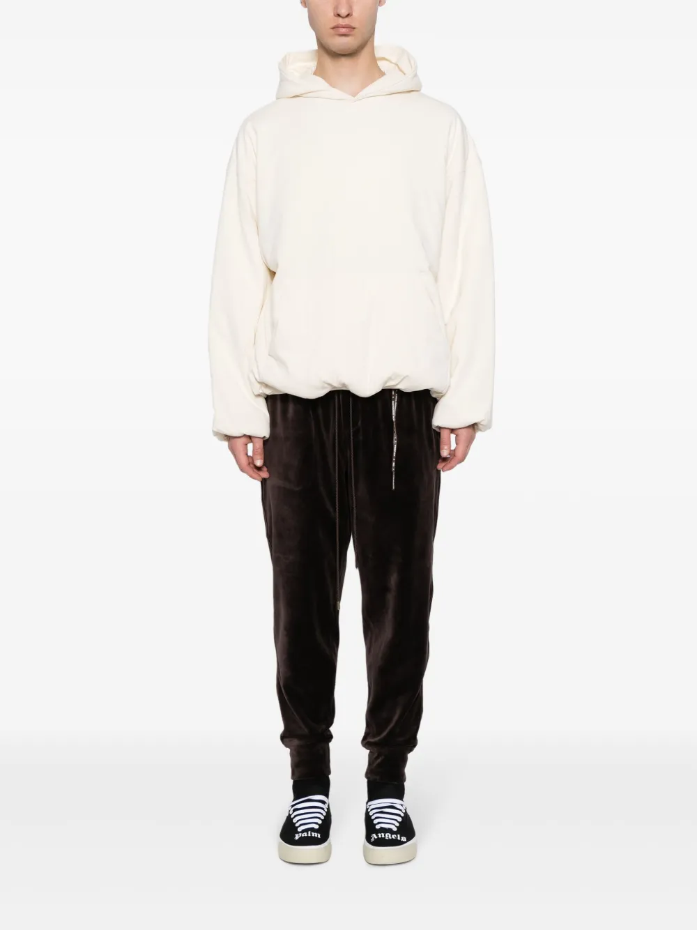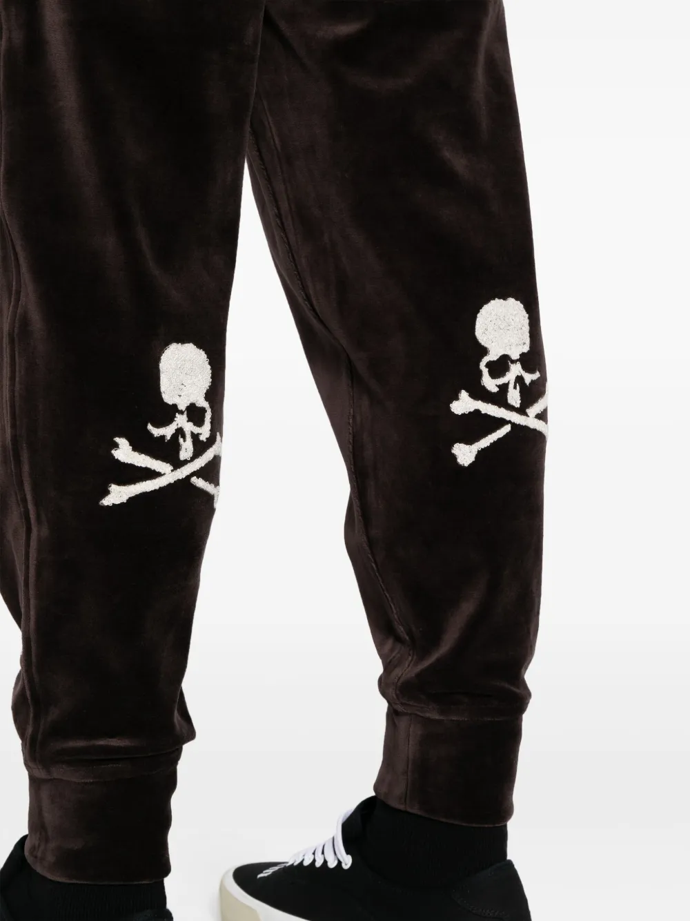 Кофейный, смесовый хлопок, велюровая ткань, ремешки, жаккардовый логотип, аппликация в виде черепа, средняя посадка, кулиска на талии, два прорезных кармана по бокам, два накладных кармана сзади, зауженный крой и эластичные манжеты.