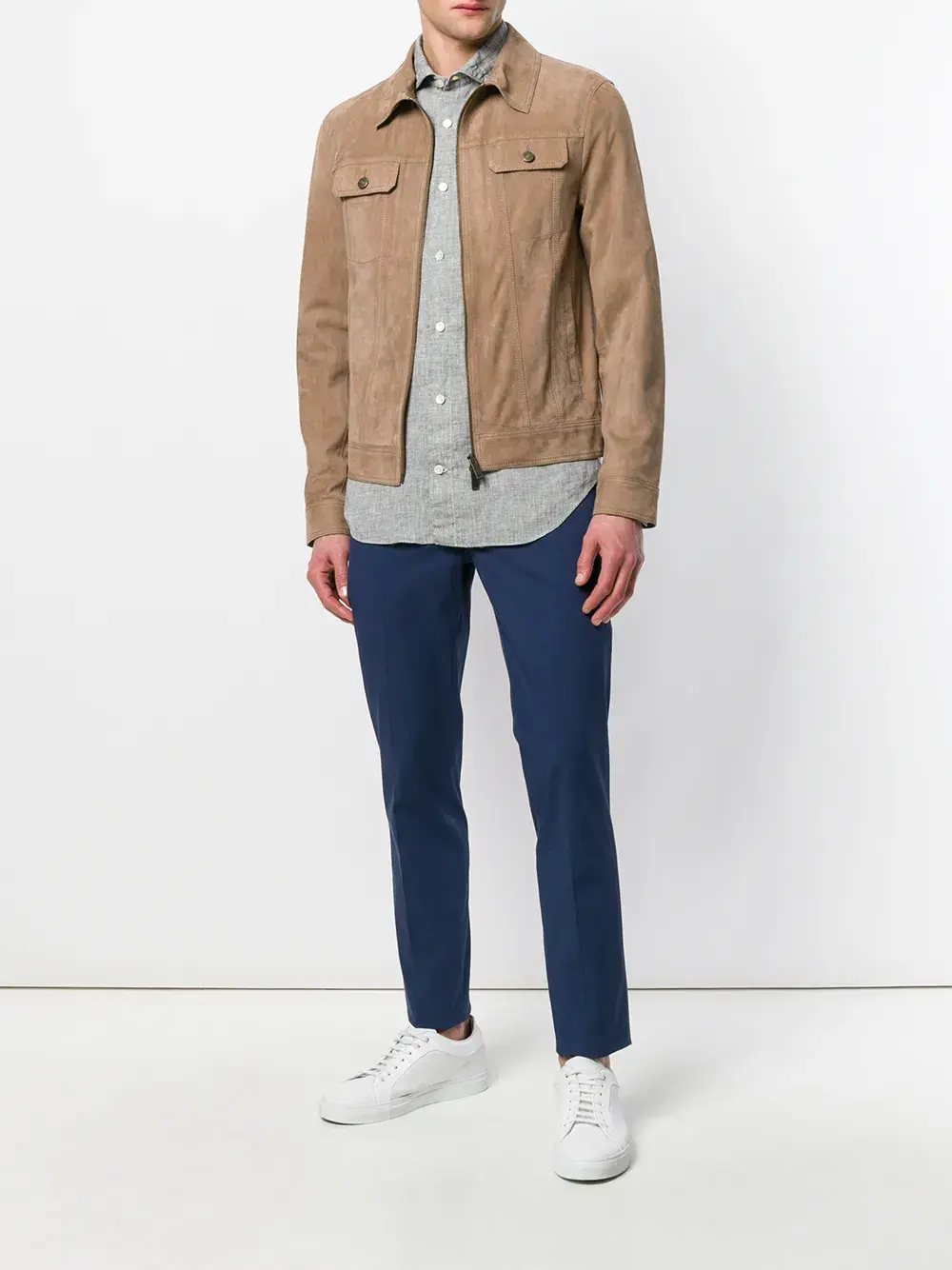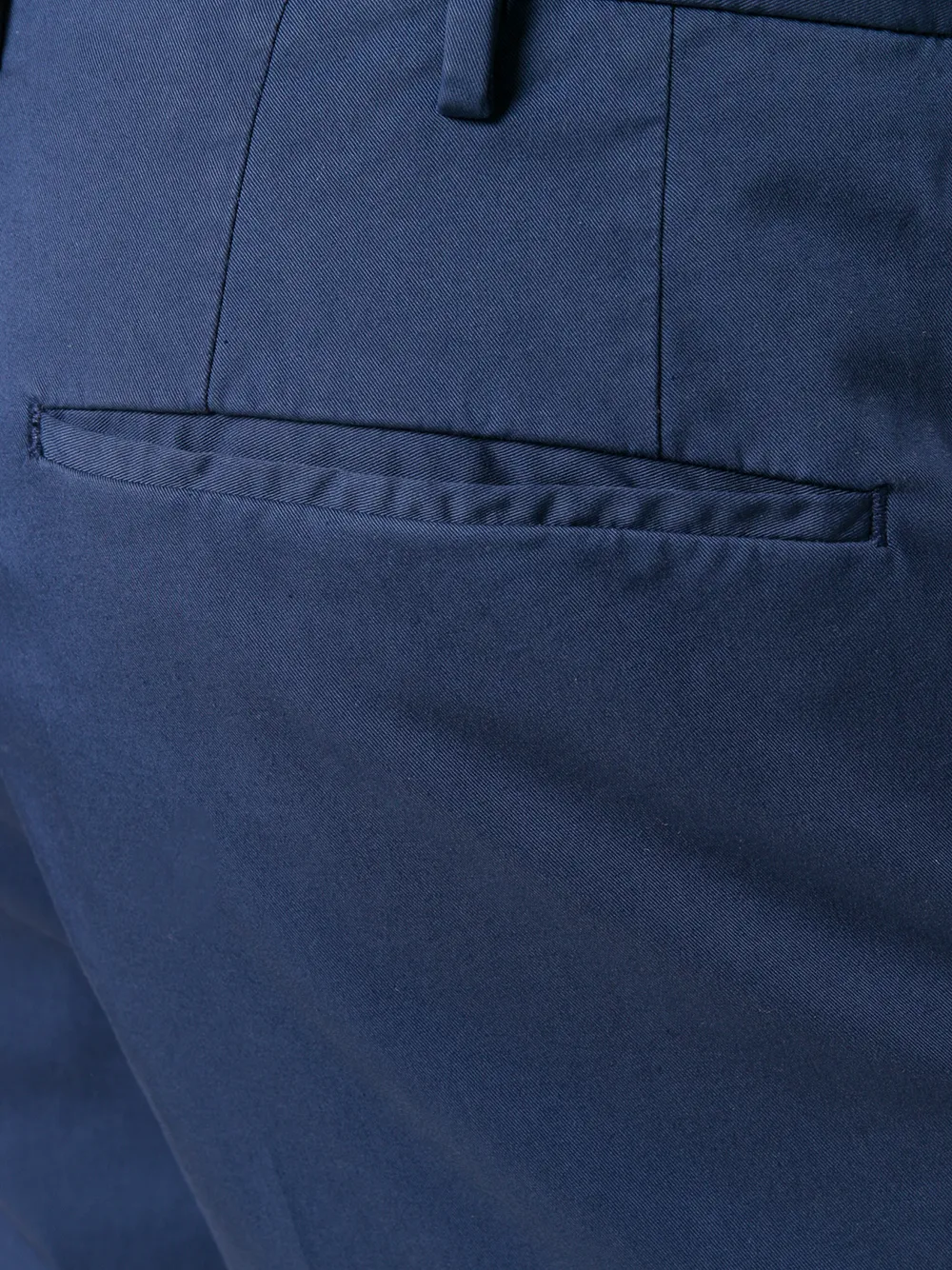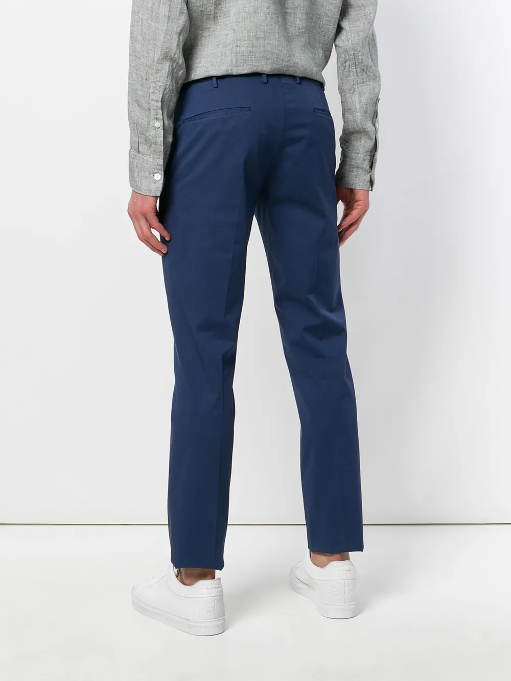 Синие брюки узкого кроя из хлопкового микса от Incotex. Петли для ремня, потайная застежка спереди, прорезные карманы по бокам, задние карманы с листочкой.