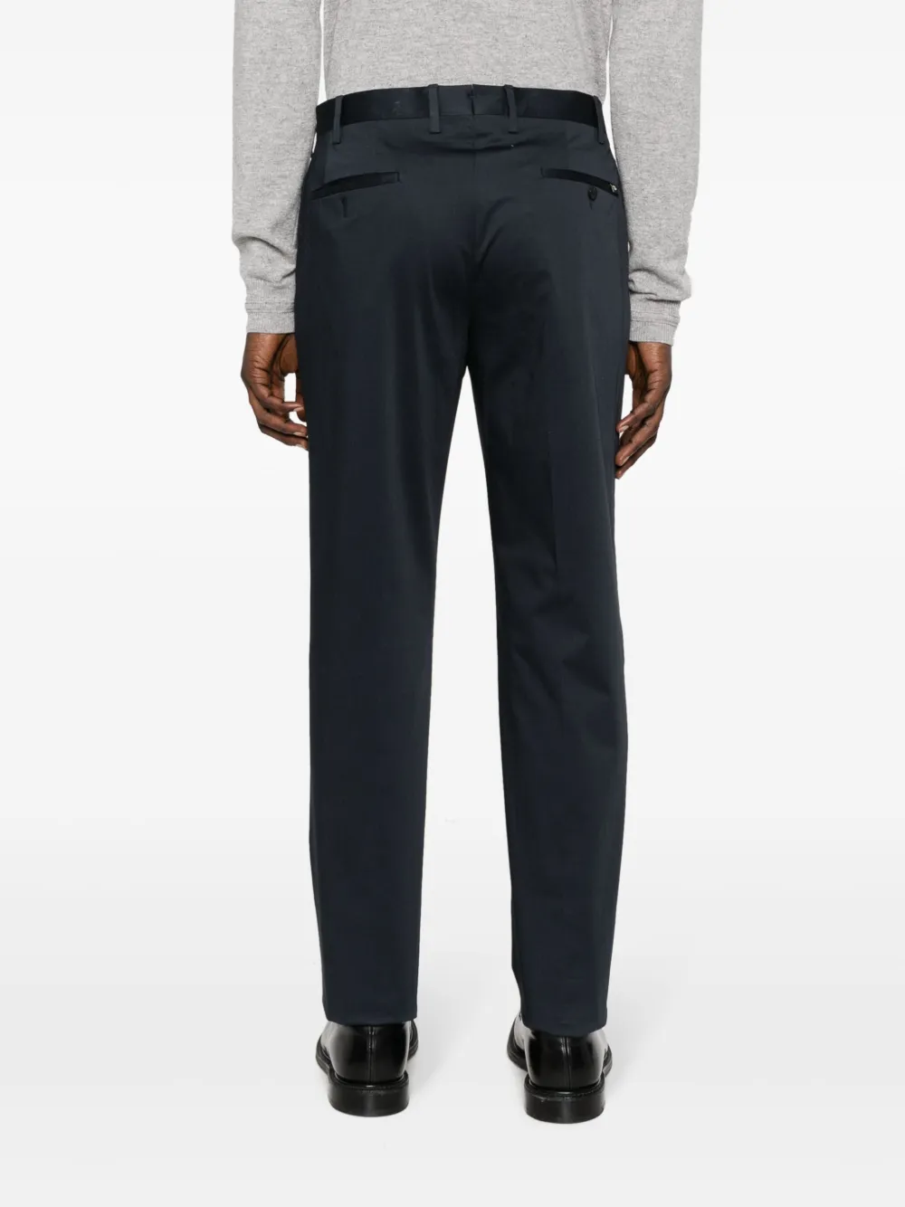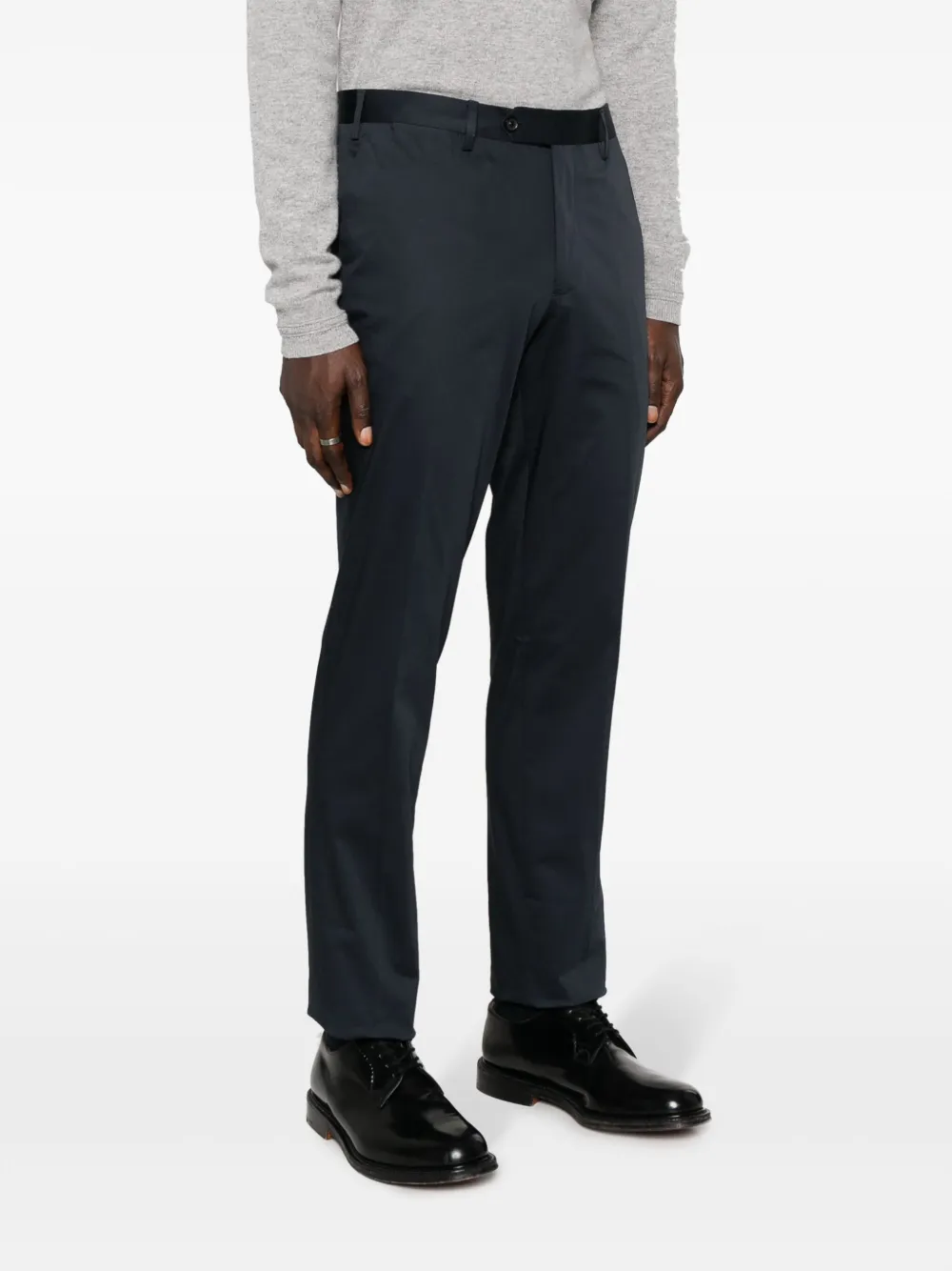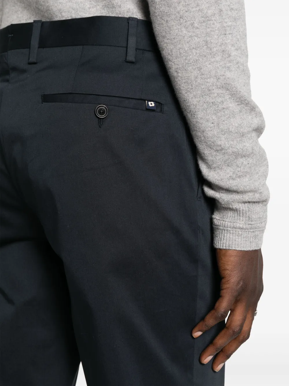 Темно-синий, эластичный хлопок, стрелки, петли для ремня, средняя посадка, узкий крой, смещенная застежка на пуговицах спереди, два вшитых кармана по бокам и два кармана с листочкой сзади.