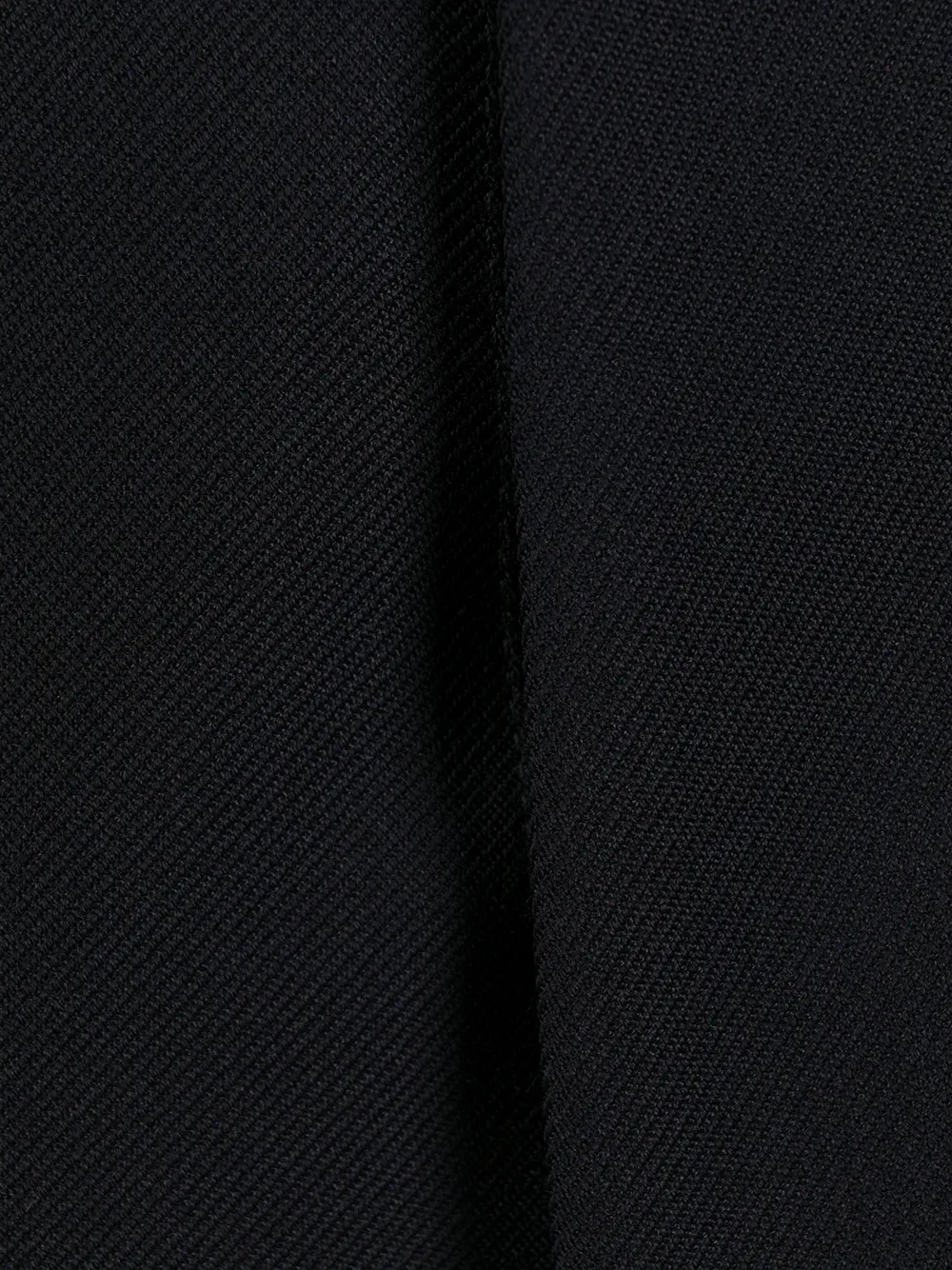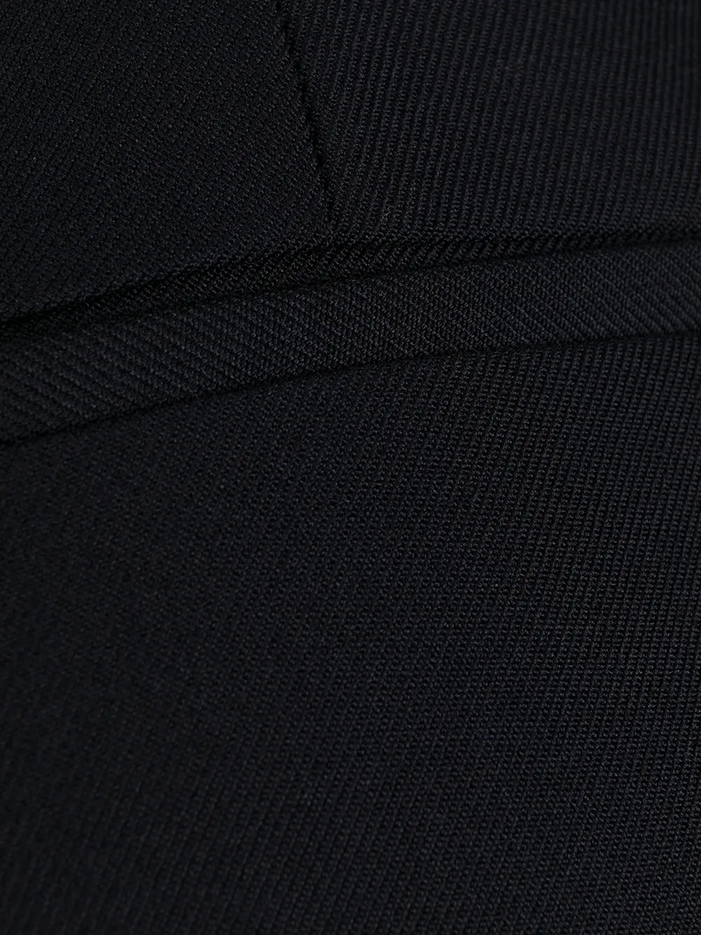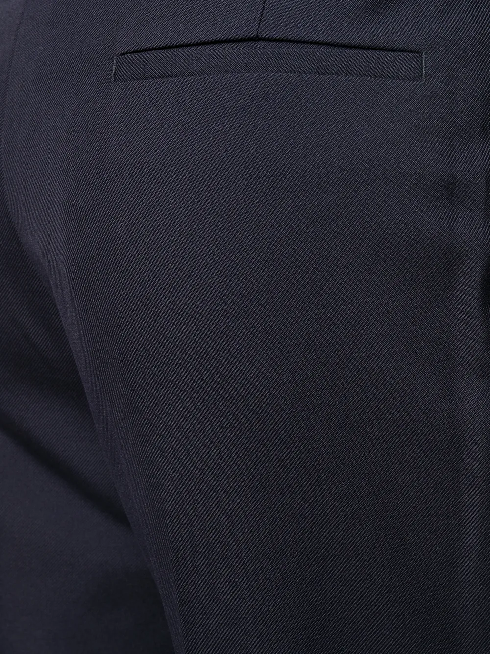 Средняя посадка, петли для ремня, потайная застежка спереди, два прорезных кармана по бокам, два кармана с листочкой сзади и стрелки.