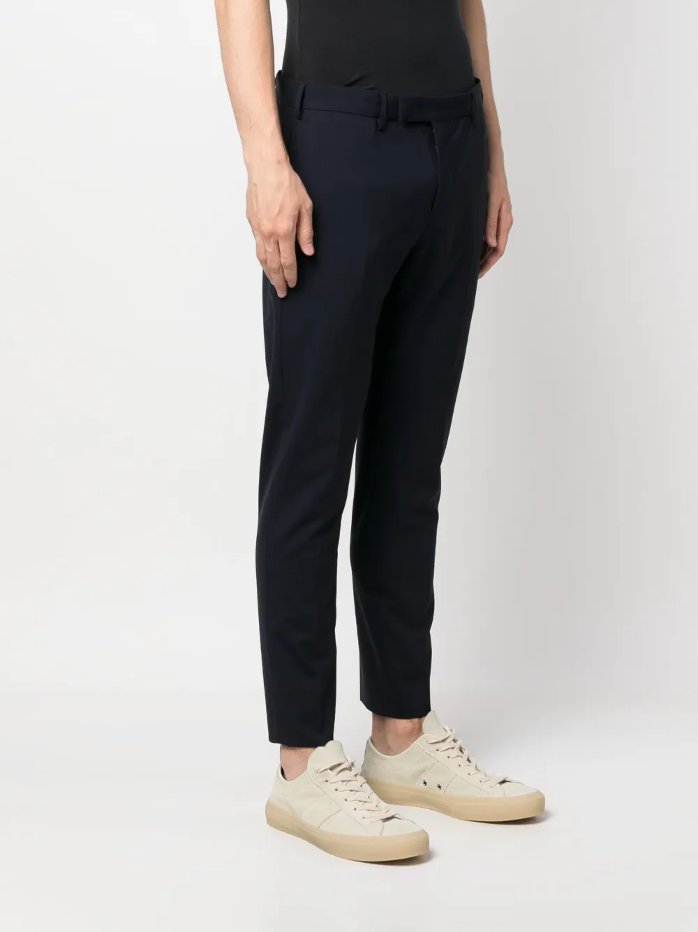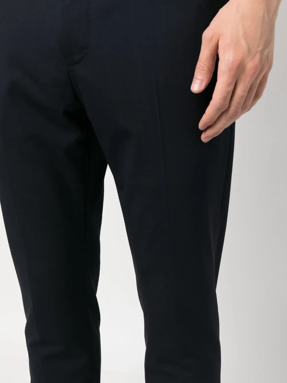 Темно-синий, смесовая необработанная шерсть, классический крой, петли для ремня, смещенная застежка спереди, потайная застежка спереди, узкий крой, два прорезных кармана по бокам, два кармана на молнии сзади и высота по щиколотку.
