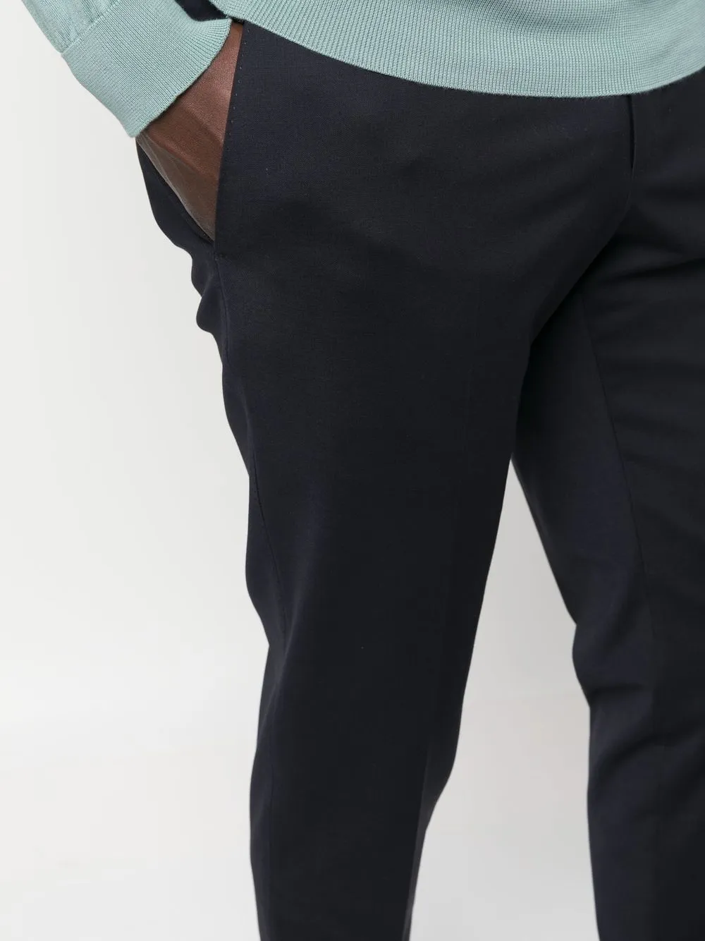 Темно-синий, стрелки, застежка на молнии и пуговице спереди, прямой крой, два прорезных кармана по бокам, два кармана с листочкой сзади и смесовая шерсть.