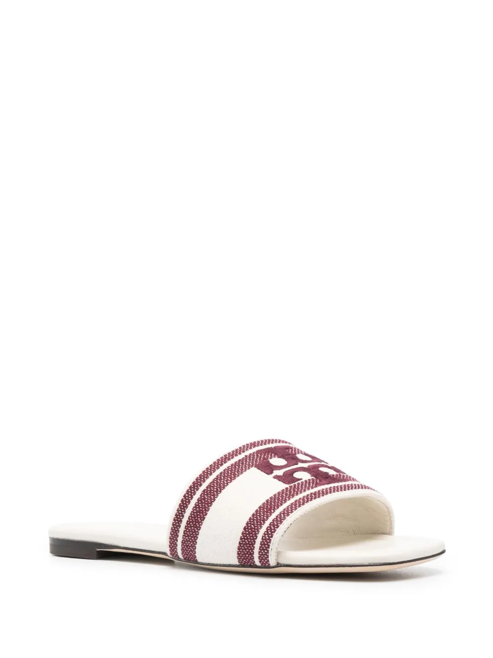 Бордовый, кремовый, телячья кожа, парусина, вышитый логотип спереди, полоски, открытый носок, ремешок на палец и плоская подошва.