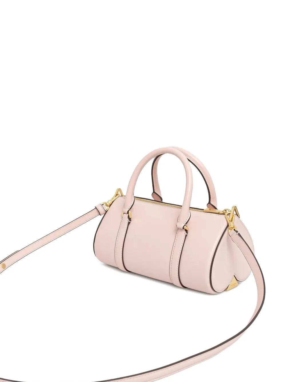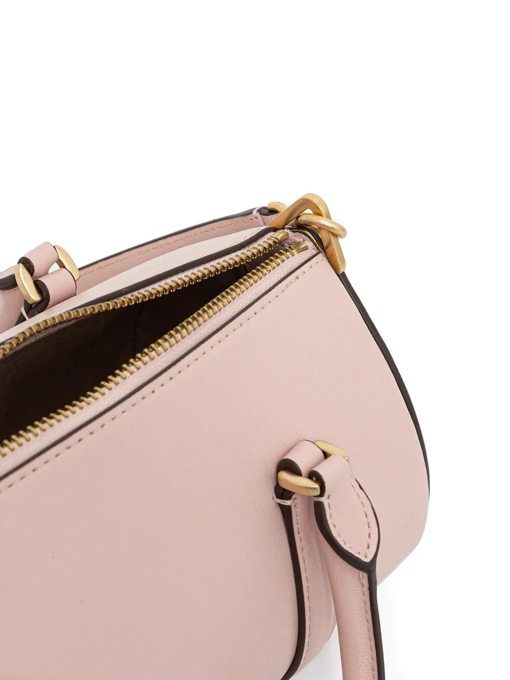 Розовое основание в форме сердца, верхняя ручка, застежка-молния, съемный ремешок, фурнитура золотистого цвета.